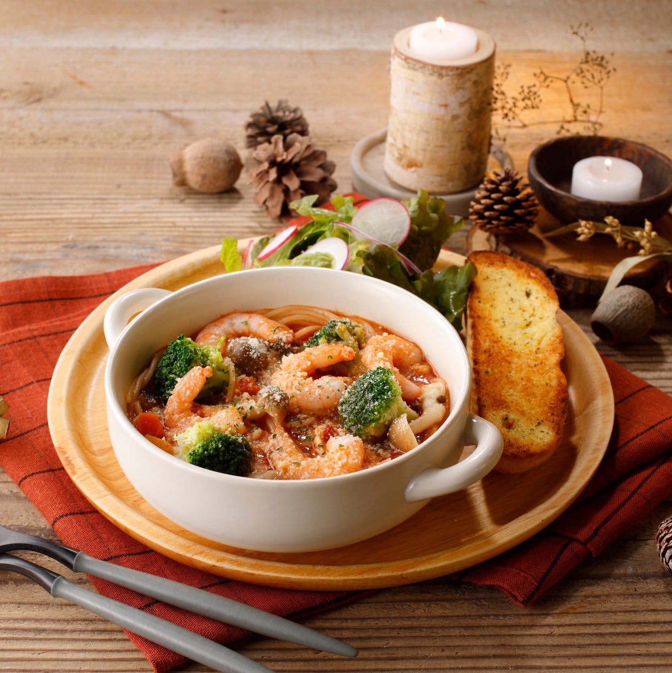 トマトの甘みを引き出したまろやかな味わいのトマトソースに生クリームをあわせ、まったりとしたクリーミーな味わいがお楽しみいただけるソースに仕上げました。大ぶりの海老やブロッコリーなど具だくさんで、食べ応えもあるパスタプレートとなっています。トッピングには粉チーズを使用し、混ぜてお召し上がりいただくことでチーズの塩味もあわせてお楽しみいただけます。彩りも豊かな秋限定のフードメニューをぜひお楽しみください。