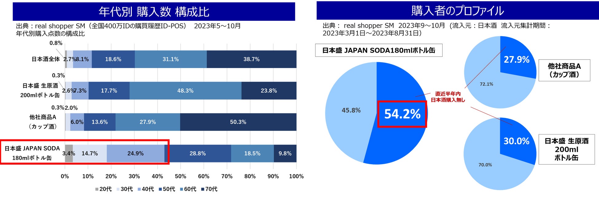 日本酒市場は昭和48年度をピークに規模縮小の一途をたどっています※1。特に40代以下のシェアが低く、若年層の獲得が課題となっている中、日本酒の新定番として2023年3月に「日本盛 JAPAN SODA 180mlボトル缶」を発売いたしました。発売以来大変ご好評頂いており、同容量の他社商品A(カップ酒)や弊社の日本酒カテゴリーの中でも若年層に人気のある「日本盛 生原酒200mlボトル缶」と比べ、より若年層の購入率が高く、直近半年で日本酒を購入していない層に購入いただいている商品です。(下記グラフ参照)