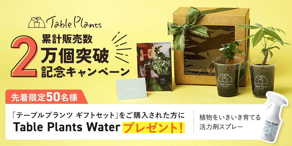 Table Plants累計販売数2万個突破を記念し、「ギフトセット」をご購入いただいた先着50名様に「Table Plants Water(活力剤)」をプレゼントいたします。