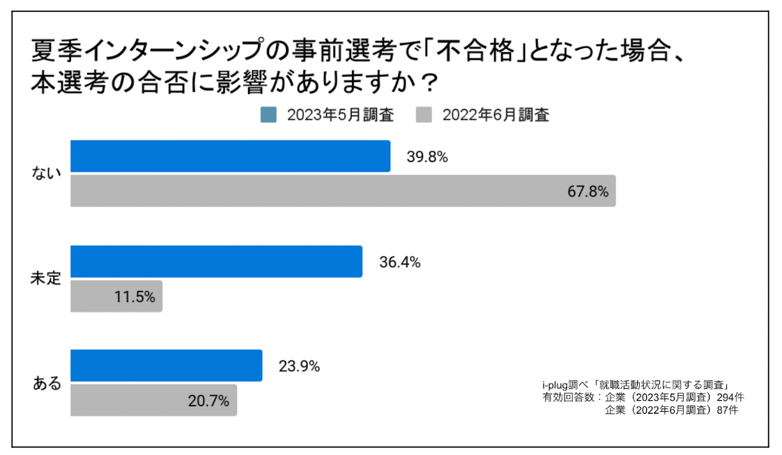 インターンシップ選考の「不合格」、約4割の企業が本選考に影響がないと回答。59.0%の学生の志望度にも影響なし。