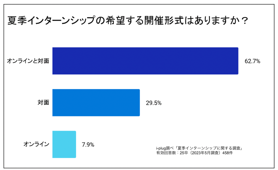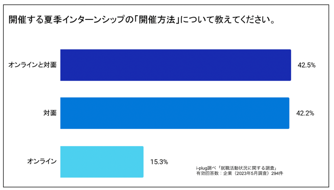 企業を対象とした夏季インターンシップの開催形式に関する調査では、「オンラインと対面」と回答した企業が最多の42.5%、対面が42.2%でした。半数近くの企業がオンラインを活用しながら採用活動を進めていることがわかりました。