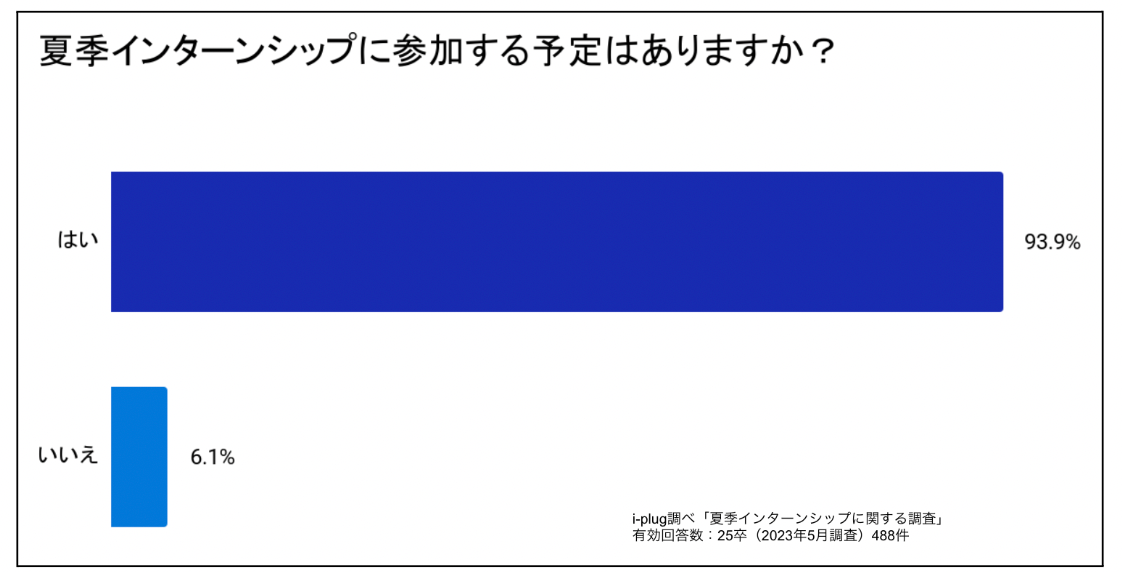 回答学生の93.9%が「はい」と回答。「参加しない」と回答した学生は、わずか6.1%でした。夏季インターンシップの参加は、主流になりつつあることが推察できます。