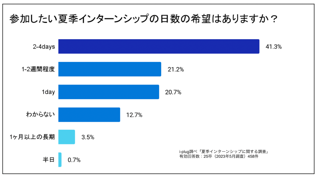 「2-4days」が最多の41.3%。次いで、「1-2週間程度」が21.2%、「1day」が20.7%でした。比較的、短期のインターンシップが人気であることが推察できます。