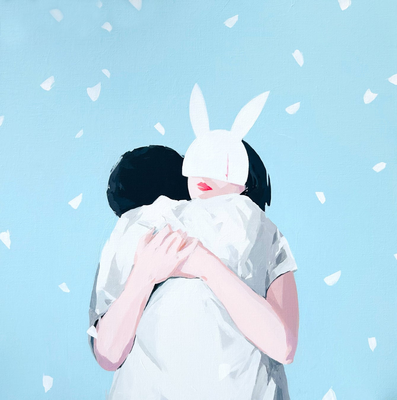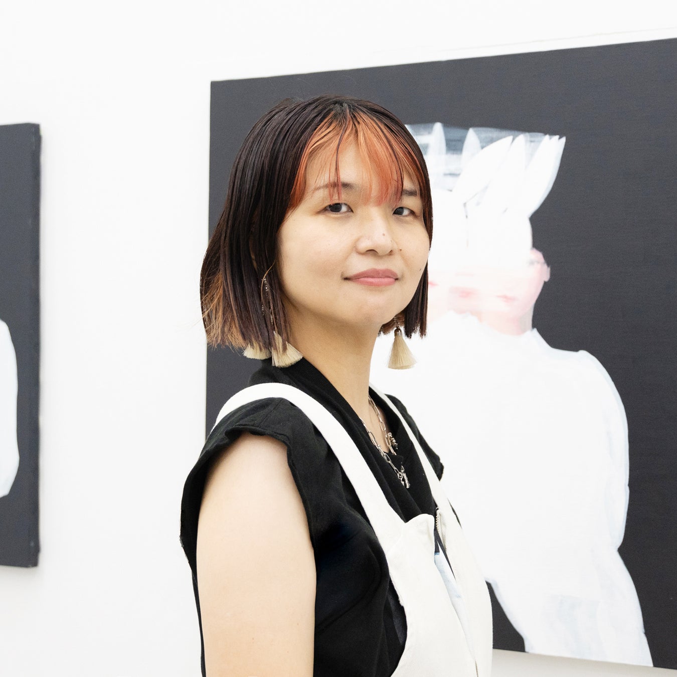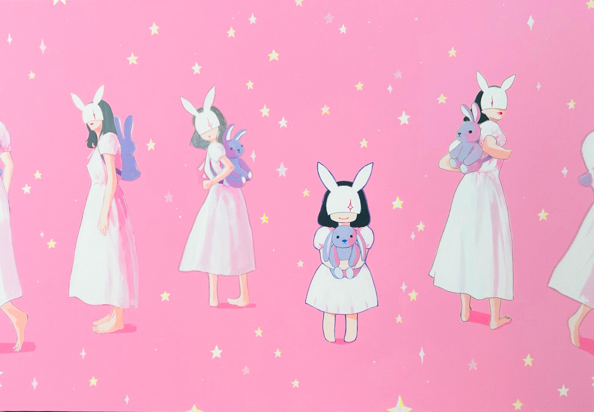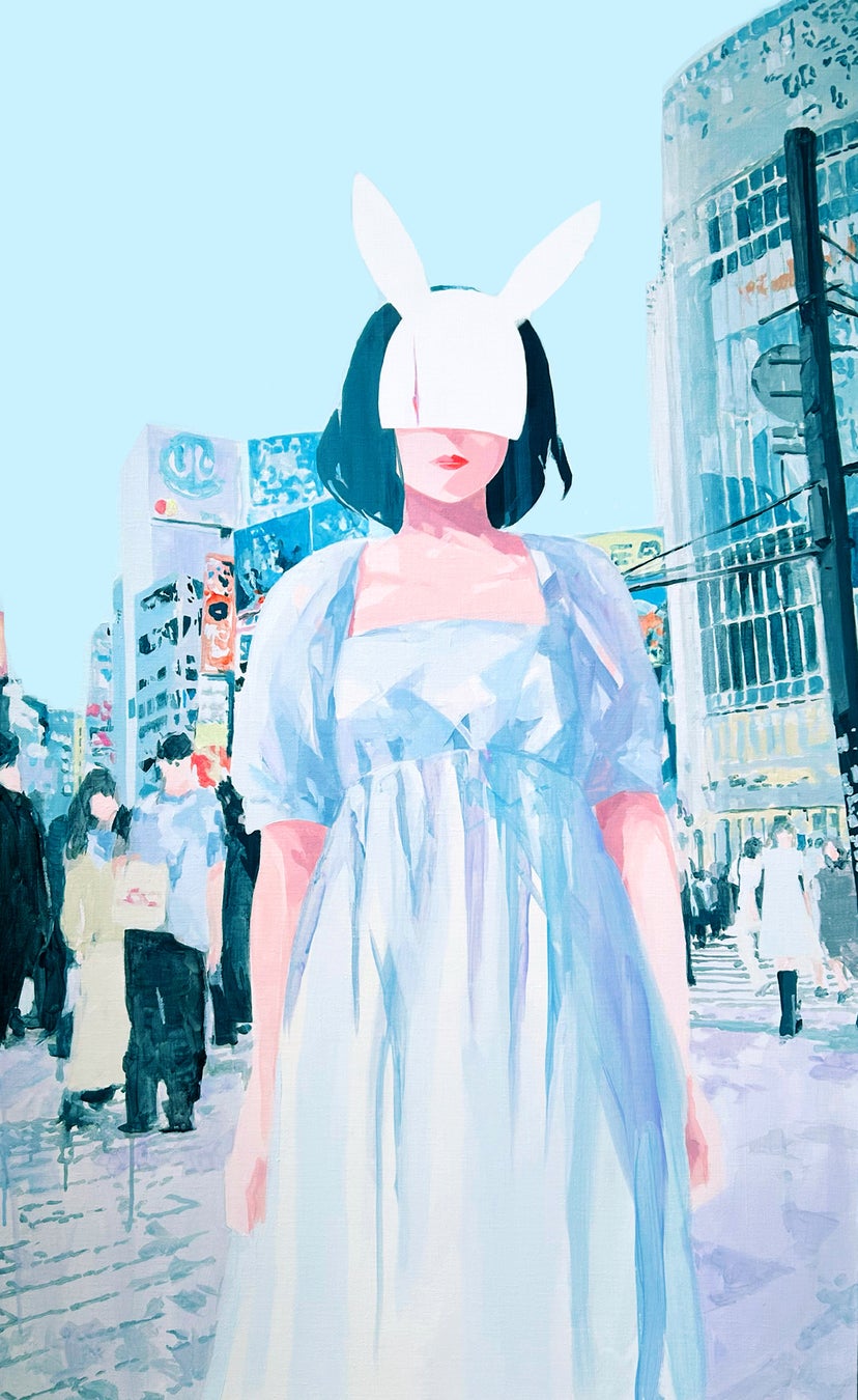 女子美術大学デザイン学科を卒業後、「ウサギの仮面を被った乙女」を主題に、匿名性と自己表現が交錯する現代の姿を描いてきた有村佳奈。仮面は夢の世界への入口から、現代を生き抜くためのアイコンへと変化し、愛らしさと強さが同居する彼女たちの姿を通して、“今”を生きる私たちのリアルを映し出しています。