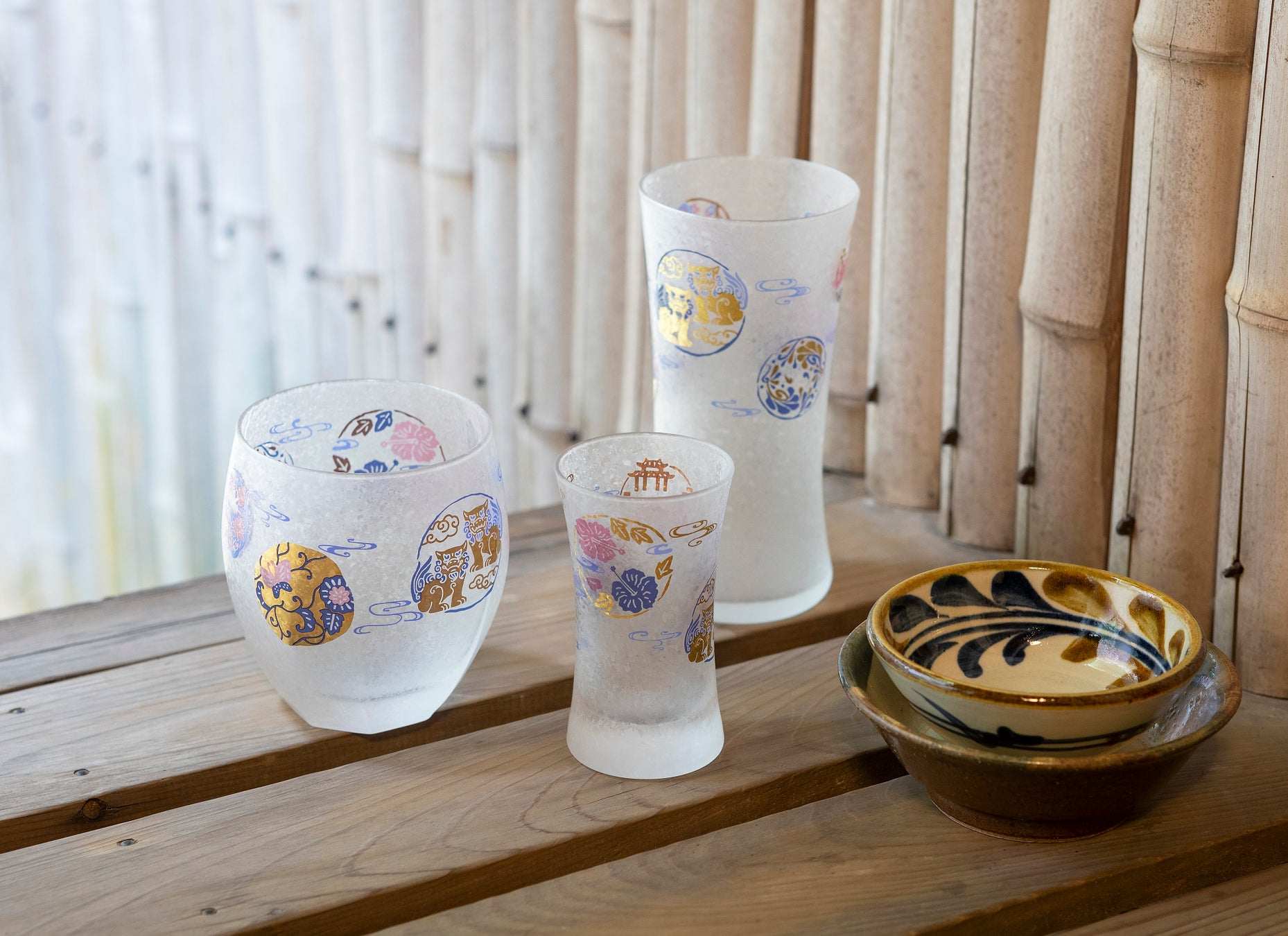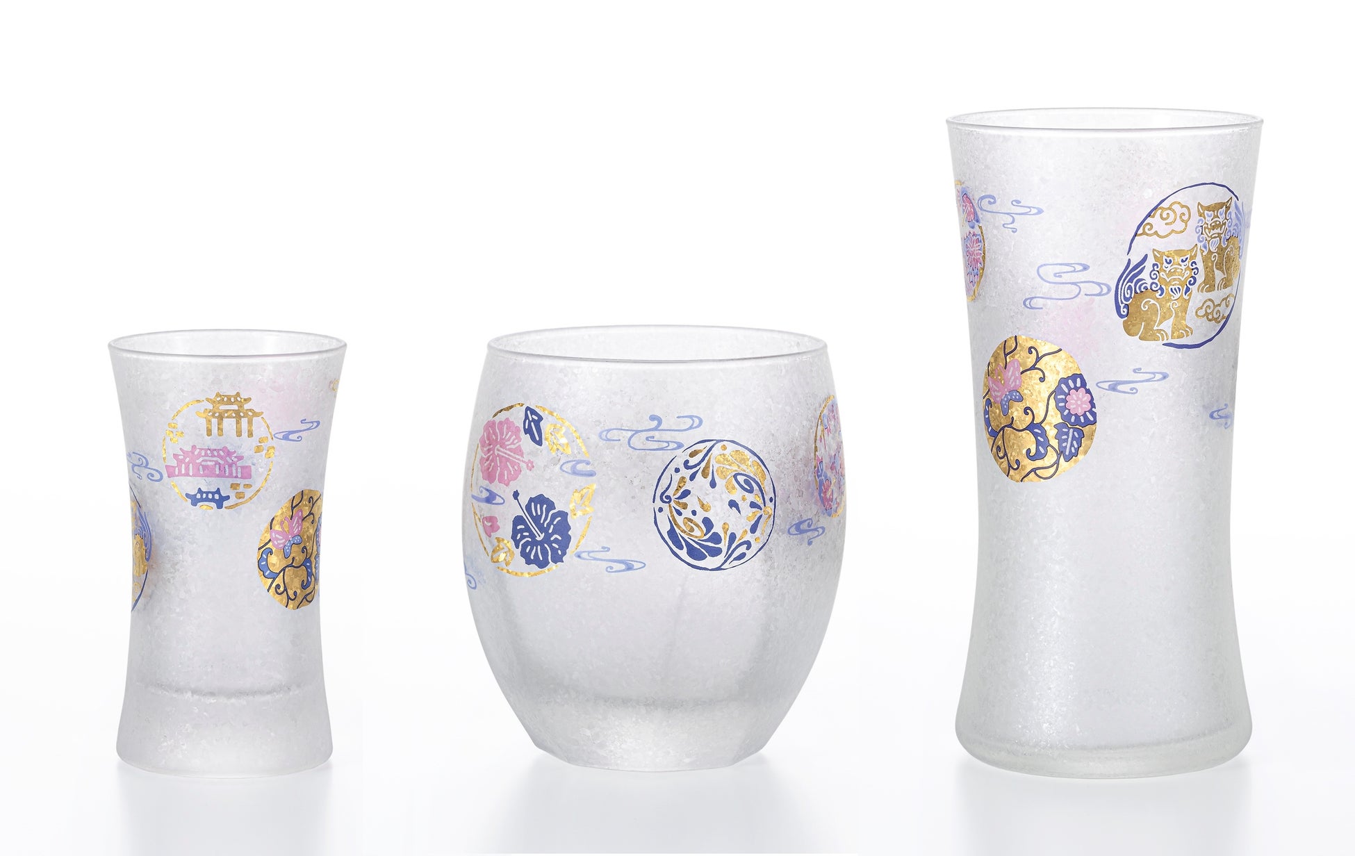 このたび第一弾として、豊かな自然と独自の文化が息づく沖縄編が登場。 沖縄を象徴する6つのモチーフ(紅型〈びんがた〉2柄、やちむん唐草、シーサー、ハイビスカス、首里城)を、縁起の良い丸紋として表現し、涼しげなみぞれ加工を施したグラスにデザインしました。きらめく沖縄のような見た目の美しさだけでなく、手に取ったときの心地よい質感もお楽しみいただけます。