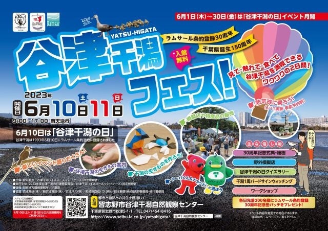 平成5年6月10日に谷津干潟がラムサール条約登録湿地となってから、今年で30周年の節目を迎えます。本市では、ラムサール条約に登録された6月10日を「谷津干潟の日」と条例で定めており、毎年6月を中心にイベントを開催しています。本年は、ラムサール条約登録30周年と千葉県誕生150周年を記念し、6月1日から30日までの期間を「谷津干潟の日イベント月間」として様々なイベントを実施します。