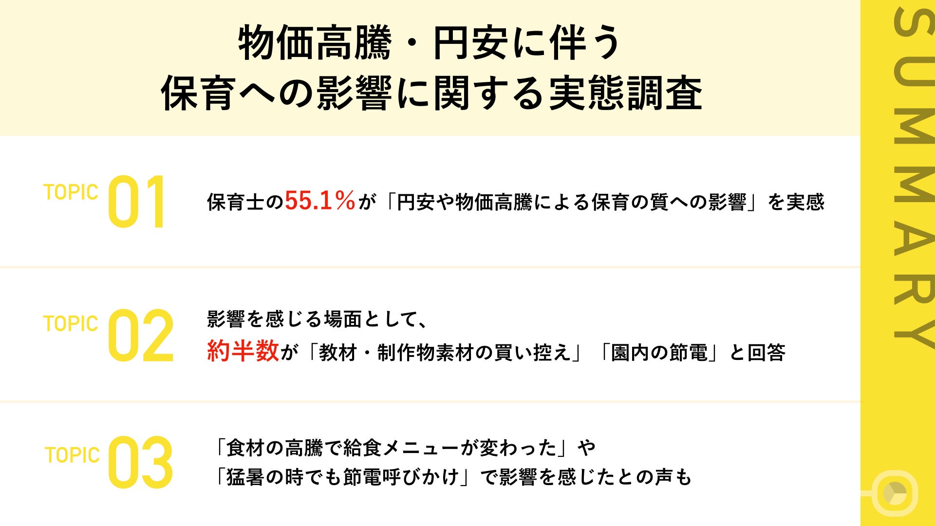 - 保育士の55.1%が「円安や物価高騰による保育の質への影響」を実感