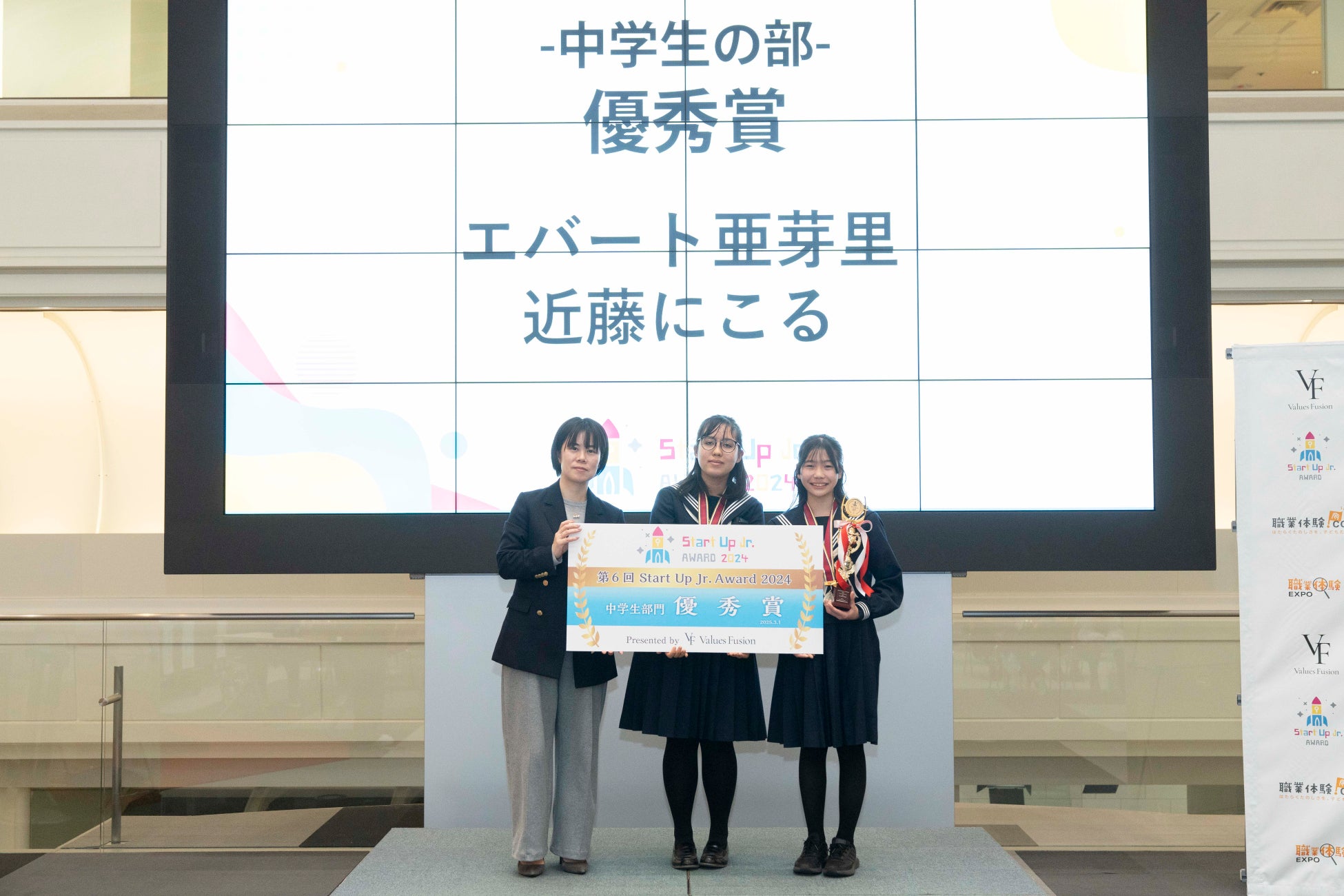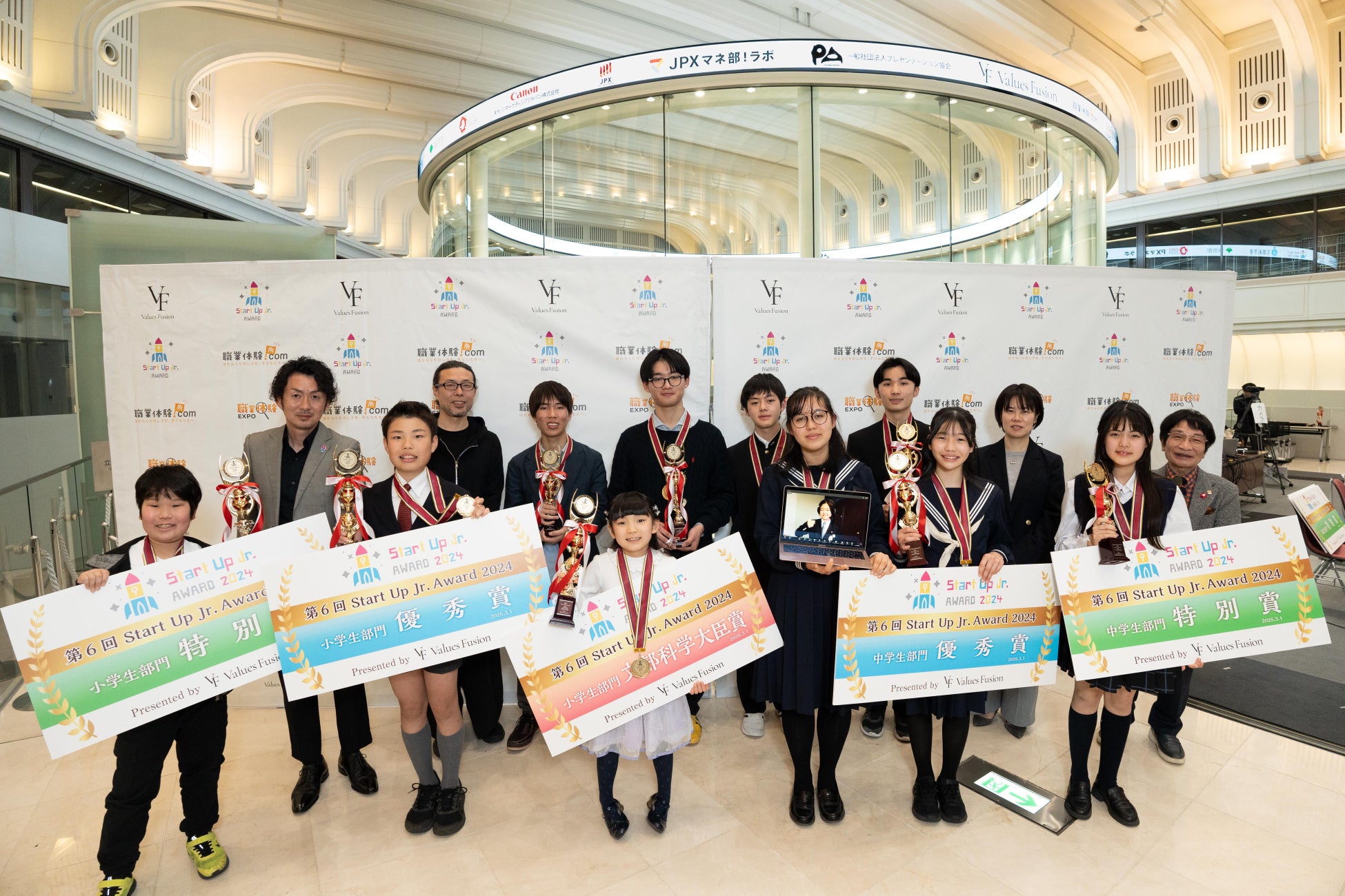 「職業体験ドットコム」や「職業体験EXPO」等、子どもの体験型キャリア教育およびサステナビリティ事業推進をサポートしている株式会社ValuesFusion(本社:東京都港区、代表取締役社長:竹内 慶太)が運営する、小学生・中学生・高校生が夢を描き、社会に一歩踏み出すアントレプレナーシップを育むプレゼンテーション大会『スタートアップJr.アワード2024』(後援:文部科学省、東京都、公益社団法人2025年日本国際博覧会協会)決勝大会が去る3月1日(土)、東京証券取引所・東証Arrowsにて開催されました。6回目となる今年度は過去最多、昨年度大会比で2割増の2,214名(1,087組)の応募があり、書類や動画の審査を経た小学生・中学生・高校生部門で各3組ずつ、計13名のファイナリストがこの決勝大会に臨みました。
