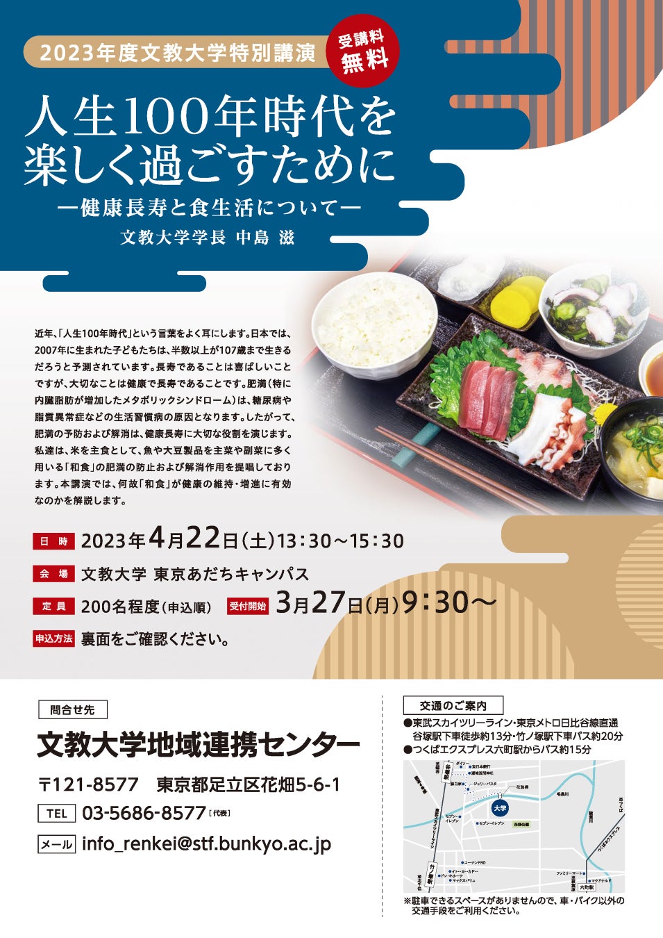 中島滋学長を講師として、文教大学特別講演 「人生100年時代を楽しく過ごすために-健康長寿と食生活について-」を開催します。