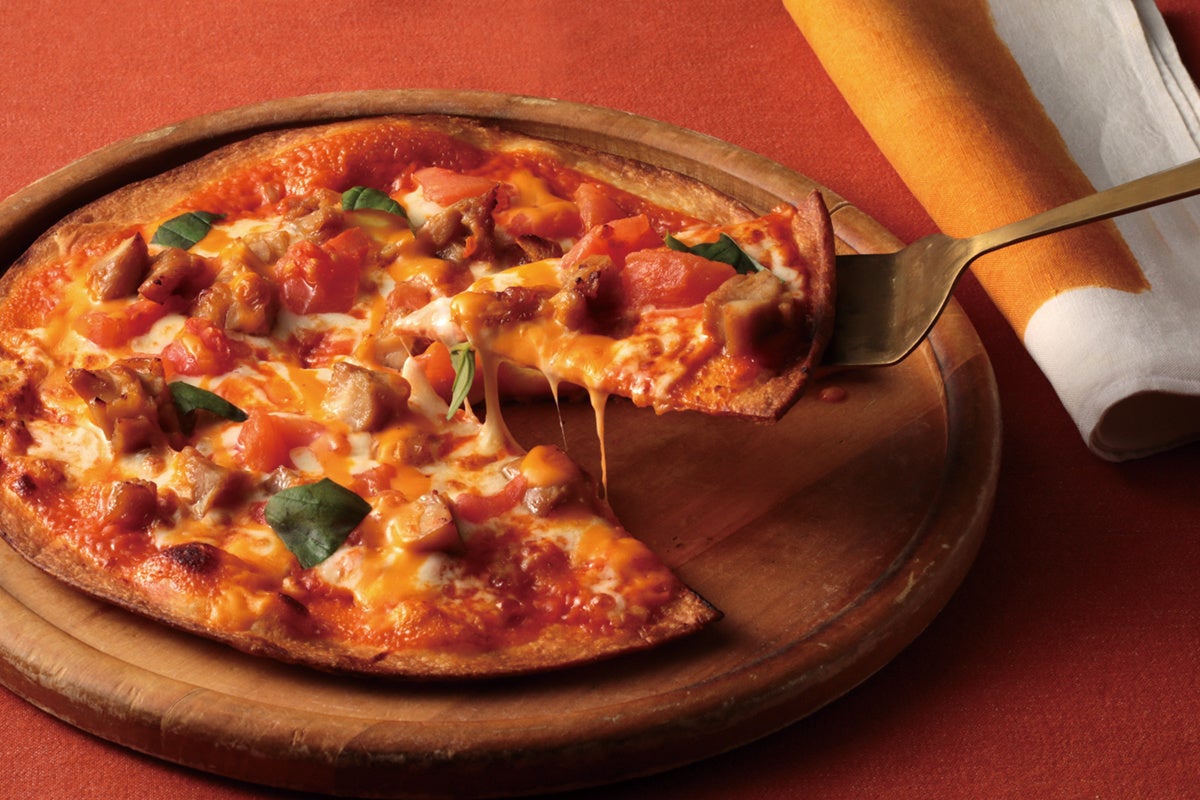 オーロラソースとレッドチェダーチーズでピザをオレンジ色に!チキンとトマトの組み合わせは、お子様から大人まで楽しめるおいしさ。