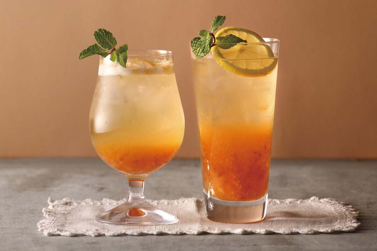 ▪<右>能古島(のこのしま)アプリコットのソーダ 638円(税込)/ノンアルコール