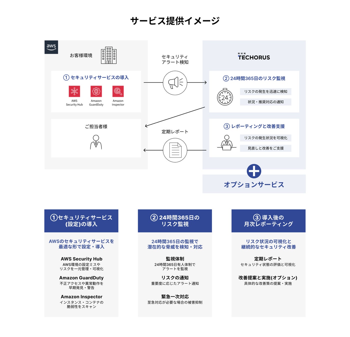 また、AWS が提供する最新セキュリティ機能を、自社環境に最適な形で導入・運用するには、専門的な知見とノウハウが求められます。こうした課題を解決するため、AWS セキュリティ分野で豊富な実績を持つNHN テコラスは、AWS ベストプラクティスに準拠した24時間365日有人体制のフルマネージド型セキュリティ運用サービスを、コスト負担を最小限に抑えた価格帯で提供開始しました。