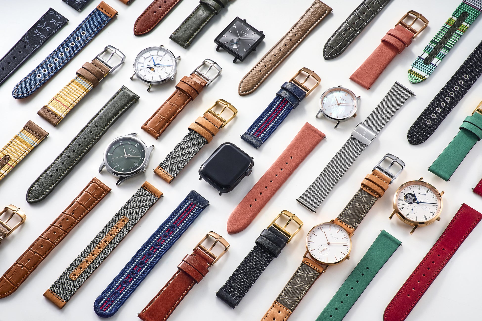Apple Watchをはじめとしたスマートウォッチや、他ブランドの腕時計にも対応したストラップを展開しています。Apple Watchは専用のアダプター(¥550)とセットでお使いいただくことで対応可能。ストラップの幅もKnotの18mmに加えて、20mm、22mmをご用意。