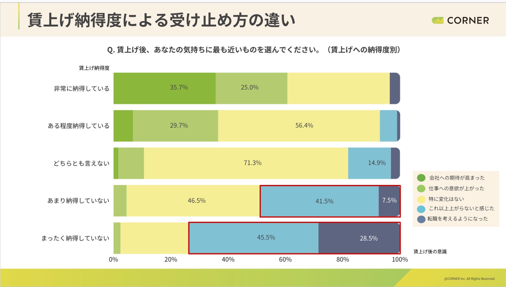 賃上げに対する納得度別に意識変化を比較したところ、納得していない層では「これ以上上がらない」と感じる割合が高く、転職を考える割合も高い水準にあった。