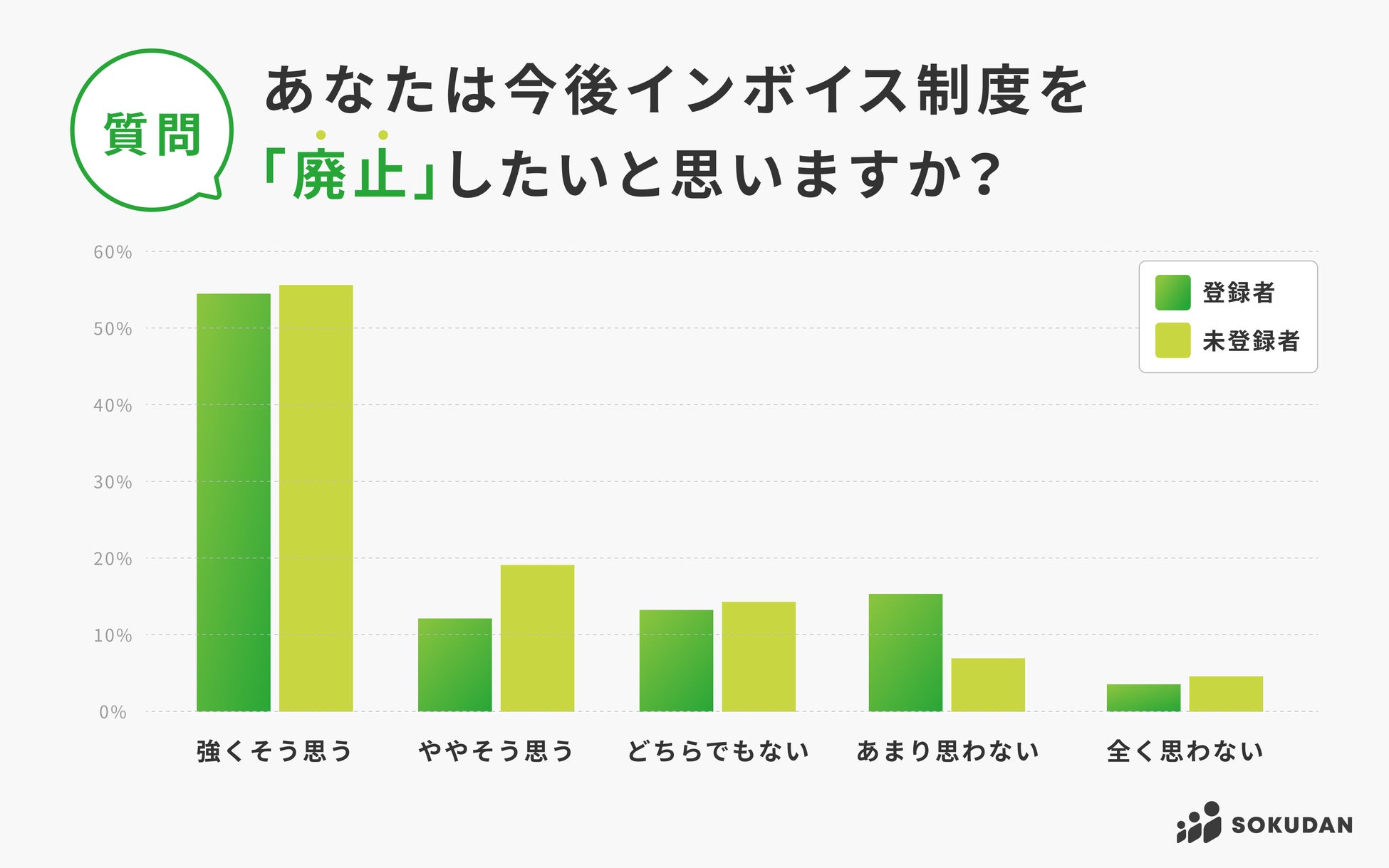 インボイス制度を廃止したいと思うかについては、両者とも、半数以上がインボイス制度を廃止したいと強く思っています。「ややそう思う」も加えると、登録者67.3%・未登録者74.6%がインボイス制度廃止を希望しています。
