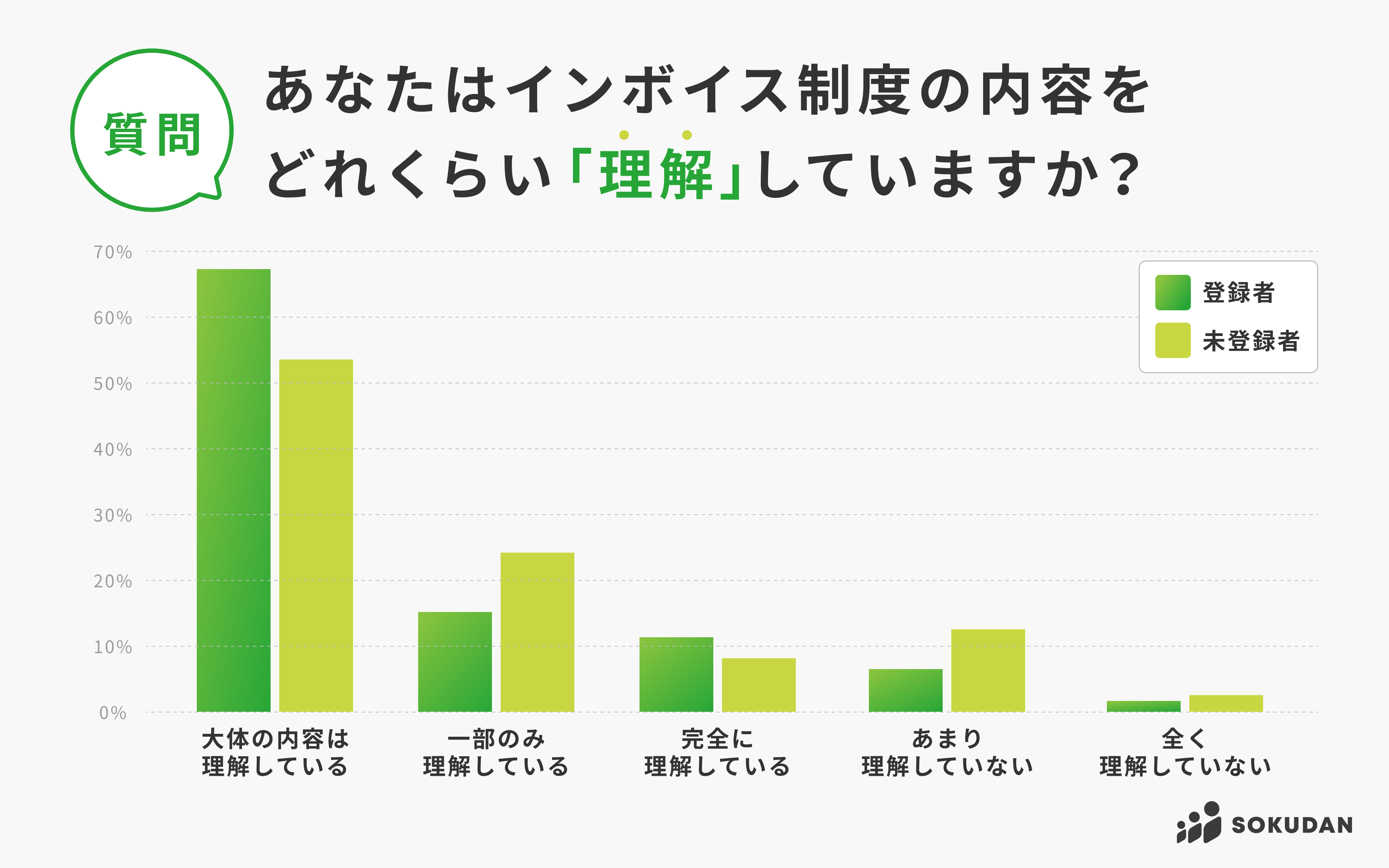 インボイス制度の理解度については、登録者は大多数が「大体の内容は理解している」と回答しており、未登録者でも同様の傾向が見られますが、割合はやや低いです。未登録者は「一部のみ理解している」と「あまり理解していない」の回答が多く、全体的な理解度は登録者に比べてやや低いと言えます。