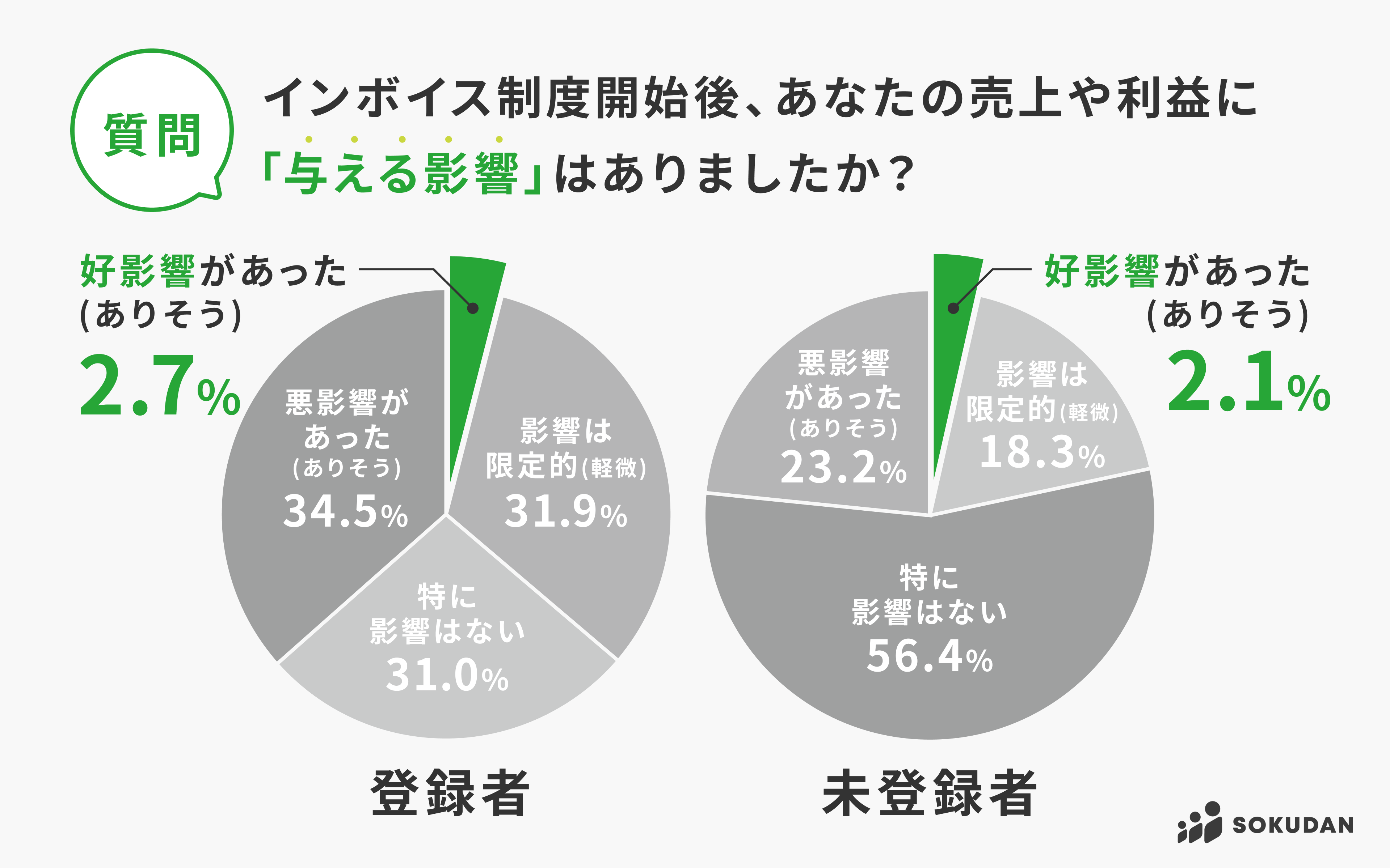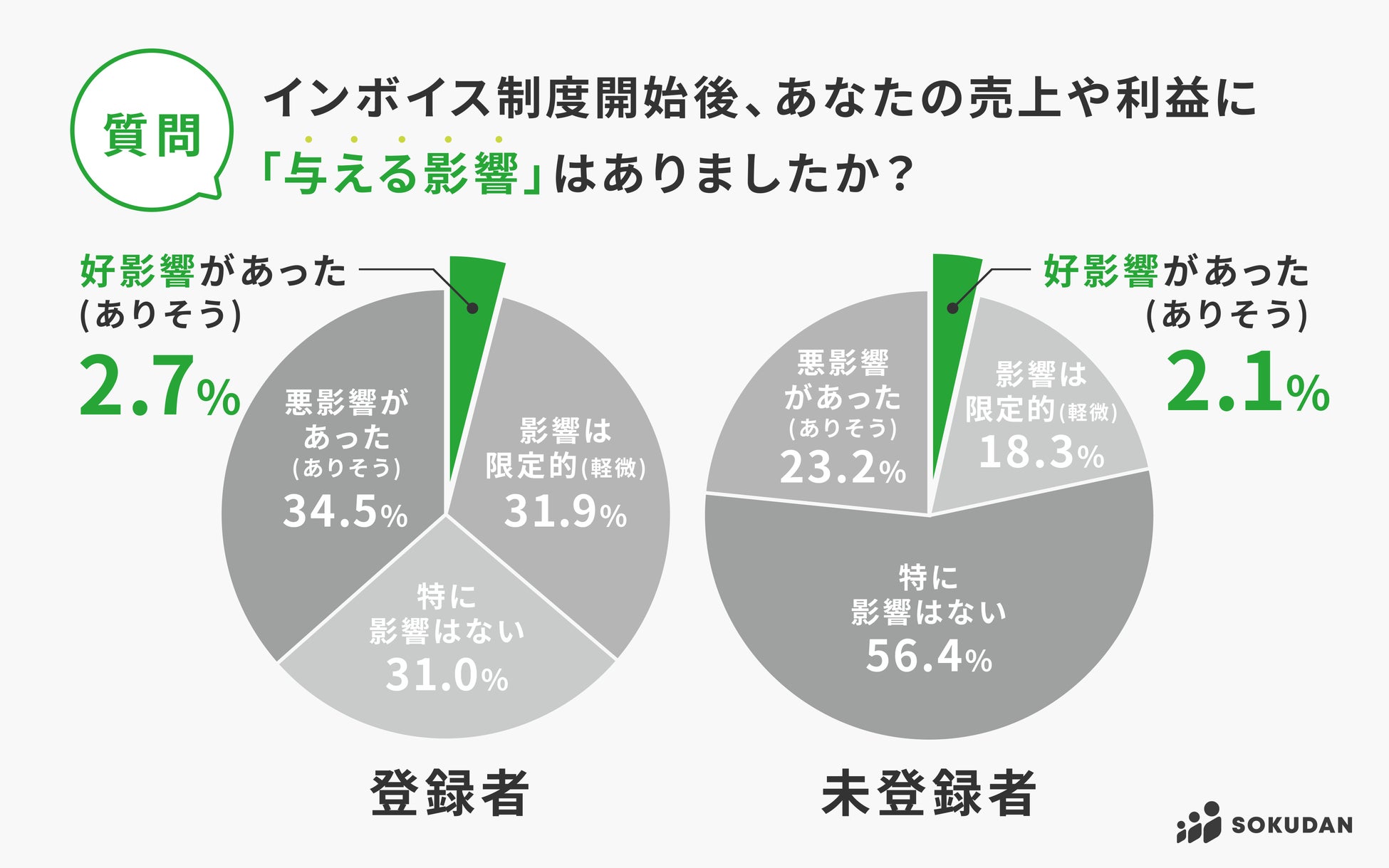 【インボイス開始直後アンケート第3弾】登録者と未登録者の比較|両者とも好影響はわずか2%、登録者35%が「売上や利益に悪影響があった」、未登録者56%は「特に影響はない」