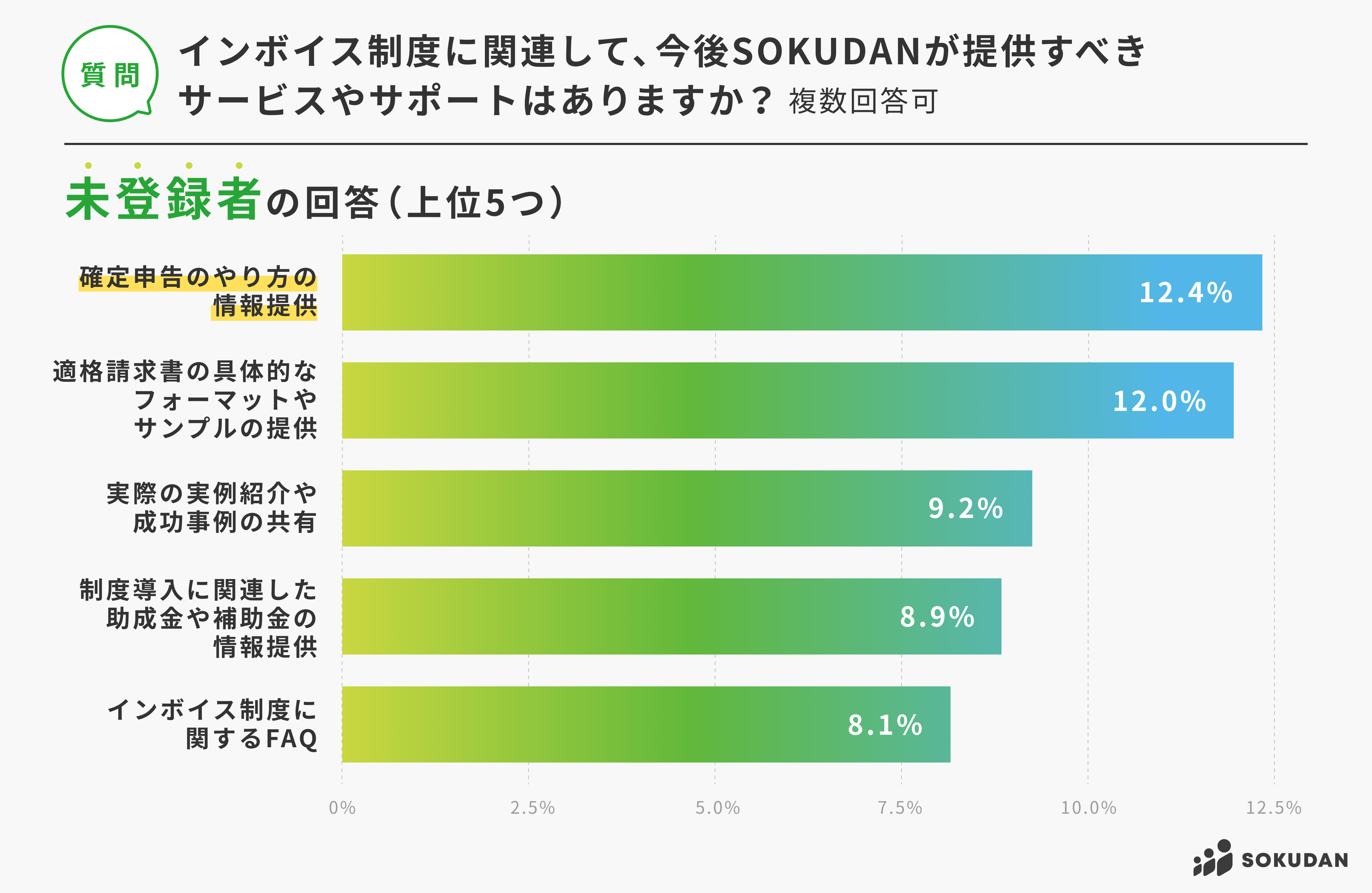 インボイス制度において、SOKUDANへのサポートに対する要望は、両者ともに「確定申告のやり方の情報提供」と「適格請求書の具体的なフォーマットやサンプルの提供」を最も多く求めており、ハウツーやフォーマットなど、より具体的な内容が上位を占めています。