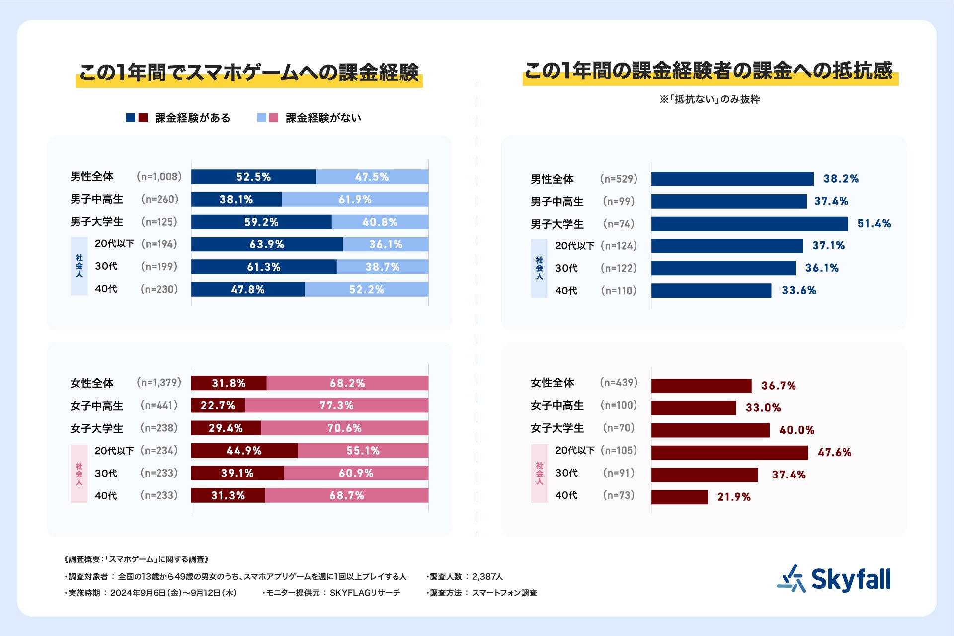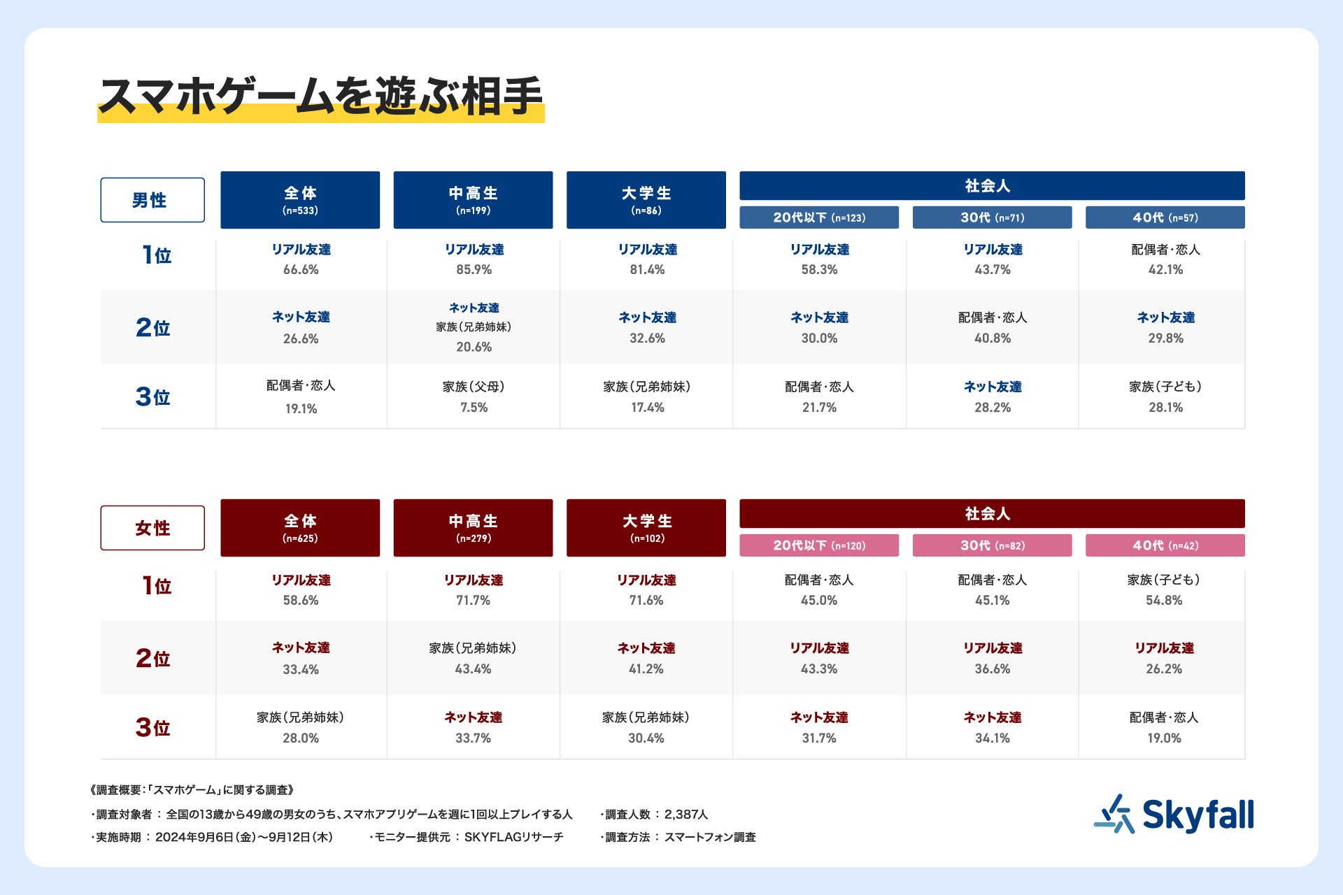 株式会社Skyfall(本社:東京都港区、代表取締役社長:長谷川 智一、以下Skyfall)は、当社の運営するマーケティングリサーチ事業の一環として、全国の13歳から49歳の男女のうち、スマホアプリゲームを週に1回以上プレイする2,387人(※)を対象に、「スマホゲーム」に関する調査(調査期間:2024年9月6日(金)~9月12日(木))を実施しました。