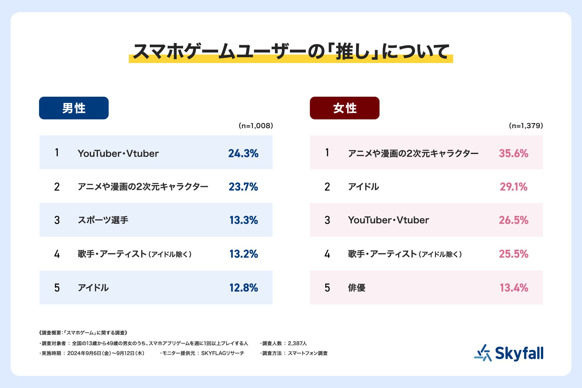 また、スマホアプリゲームを週に1回以上プレイする2,387人を対象に、「推し」について調査したところ、男性は「YouTuber・Vtuber」、女性は「アニメや漫画の2次元キャラクター」がそれぞれ最多となりました。
