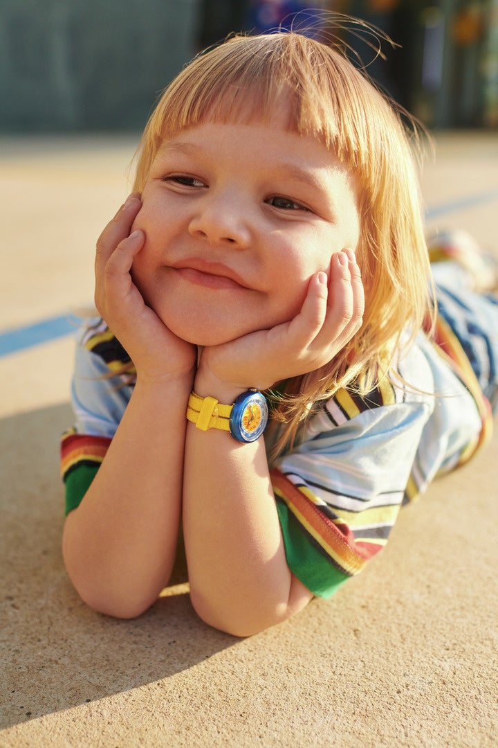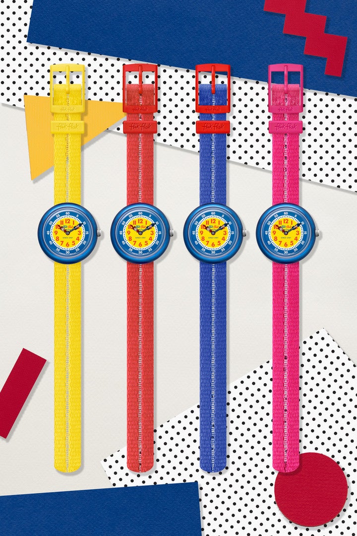 ちょうど 35 周年の今年、懐かしいデザインをリバイバルさせた Flik Flak レトロコレクションが登場しました。サステナブルな新素材に実証済みの教育コンセプトが組み合わせられ、しかも Flikと Flak の針が付いているので、時刻の読み方も身につけられます。トレンドは必ず繰り返す!