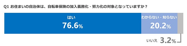 1. お住まいの自治体が自転車保険の加入義務・努力化の対象となっている方は76.6%