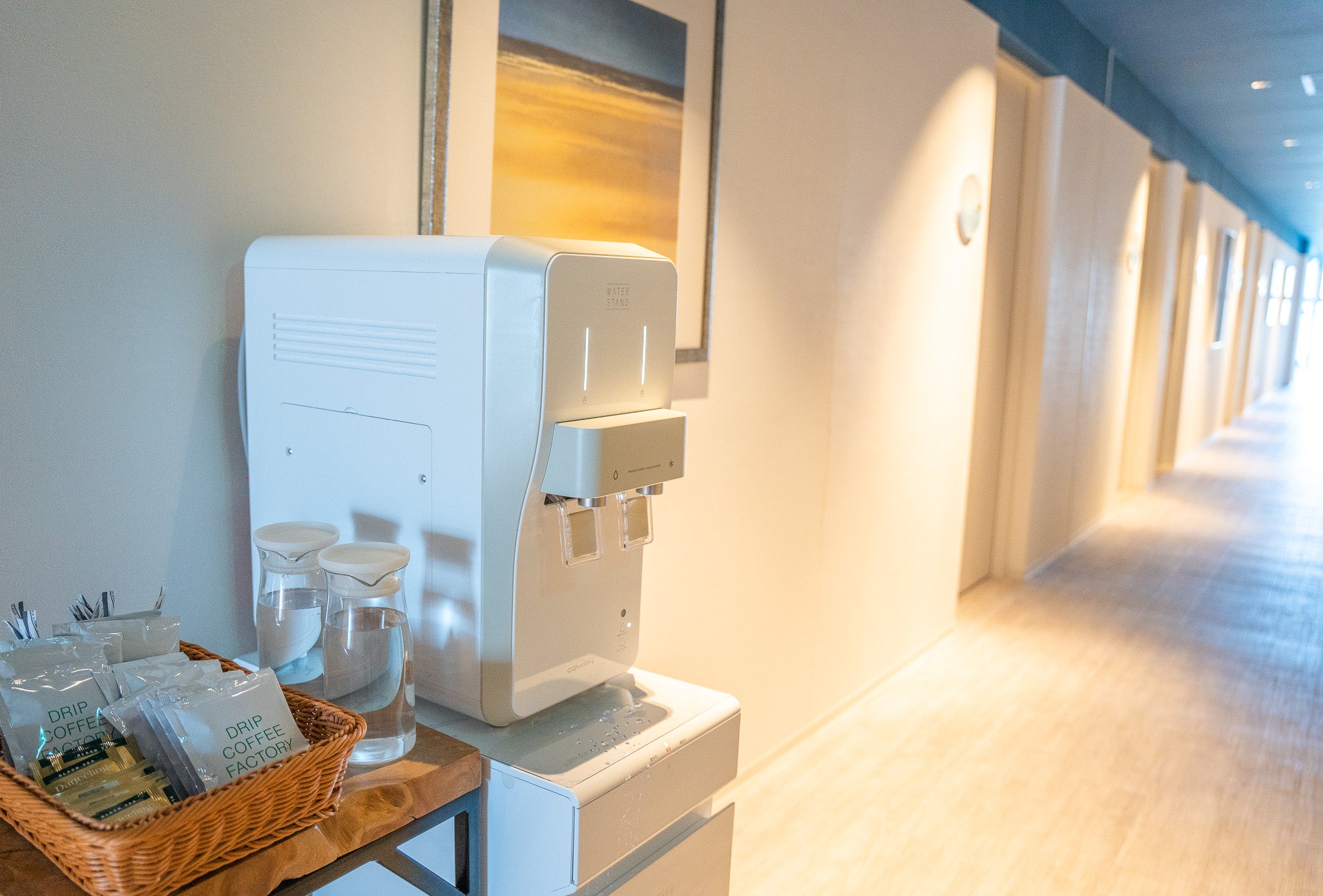 お部屋には浄水を入れた貸し出し可能なガラスのボトルをご準備しており、お客様ご自身でウォーターサーバーにて水を補充できる仕組みを取り入れました。もちろん、マイボトルへの給水も可能です。