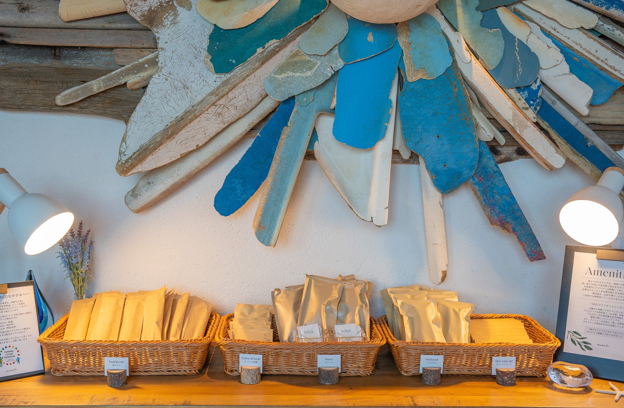 環境への配慮と使い捨てを減らすための取り組みとして、お部屋にアメニティを置かず、フロント前にアメニティーコーナーを設置します。お客様自身で必要なアメニティをお持ちいただいています。