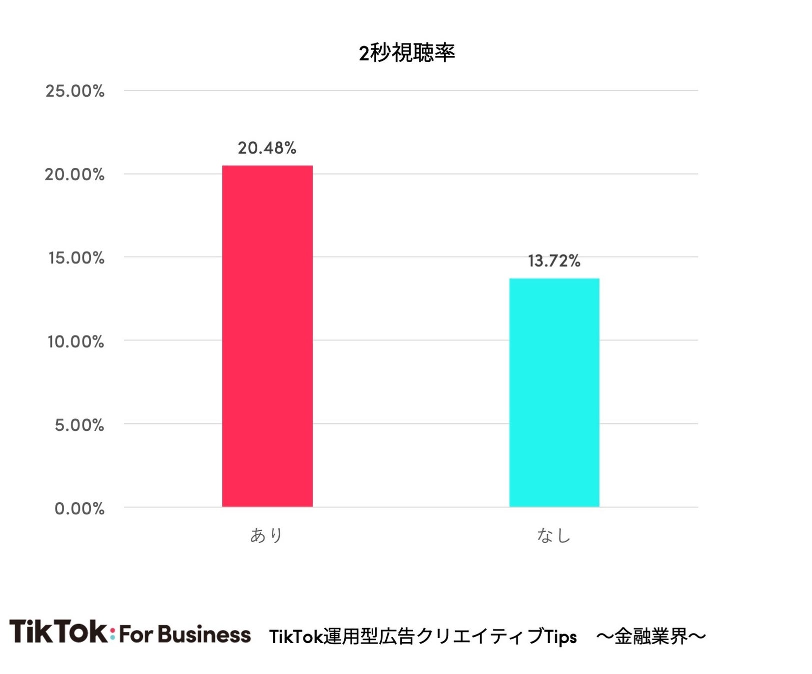 冒頭でスキップされることなく2秒視聴された割合は、「人物なし」の13.72%に対し、「人物あり」では20.48%と約149.3%高くなっています。
