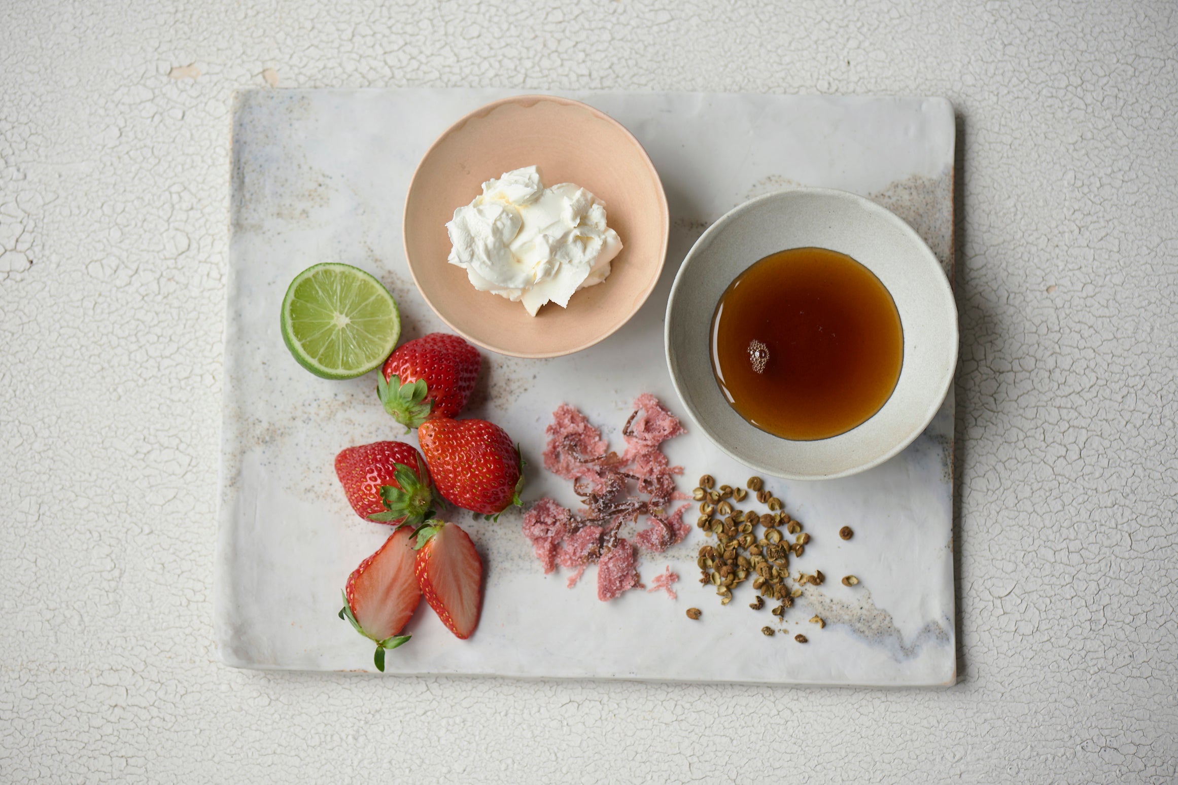 濃厚な味わいを表現しつつもクリームチーズやサワークリームなどの乳製品に負けない味わいに仕上げるために、いちごはピューレとパウダーを使いました。そこに、柑橘のようなニュアンスやハーブのような青い香りを放つ山椒とライム果汁で香りを整え、いちごのフレッシュな香りを表現しています。