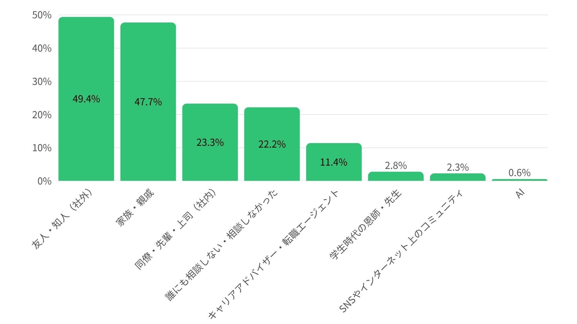 「誰にも相談しない」サイレント層が22.2%存在。また、プロである「転職エージェント」への相談は11.4%に留まる。