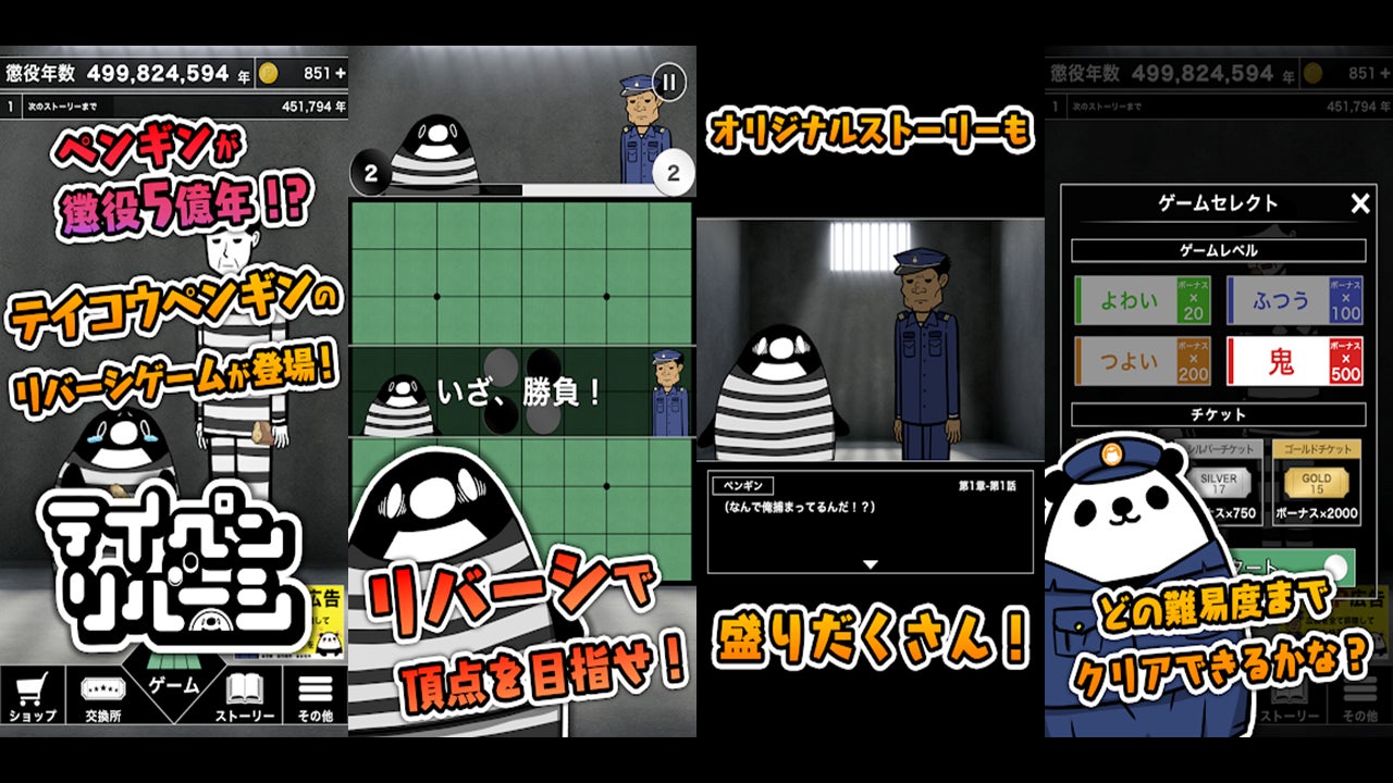 SNSアニメ『テイコウペンギン』がリバーシになって登場! ゲームの舞台はまさかの刑務所。社員旅行で海外旅行へ来ていた某企画のメンバーたち。しかし冤罪をかけられ、ペンギンだけが囚われの身に。なぜかリバーシに勝利すると刑期が短縮される刑務所で、懲役5億年になってしまったペンギンの戦いの日々が、今始まる。