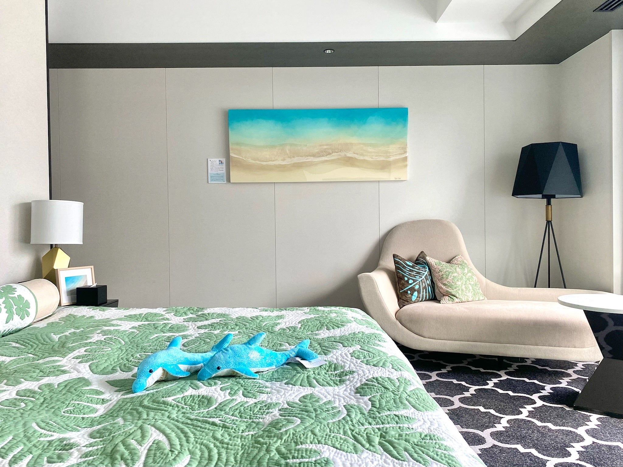 「夏休み限定 Feel ALOHA ! Hawaiian Package Room」 にハワイのトップアーティストSarah Caudle(サラ カードル)の日本に2枚しかない貴重な原画をハワイアンルームとして期間限定で販売しているお部屋のうち、12階の高層階にある2部屋に装飾いたします。ザ・カハラ・ホテル&リゾート 横浜でしか目にすることができない原画を通して、Sarah Caudleが目にしたありのままの海の色や波の動きを間近でお楽しみいただけます。まるでハワイのオーシャンフロントに宿泊しているかのような壮大な世界観をご堪能ください。