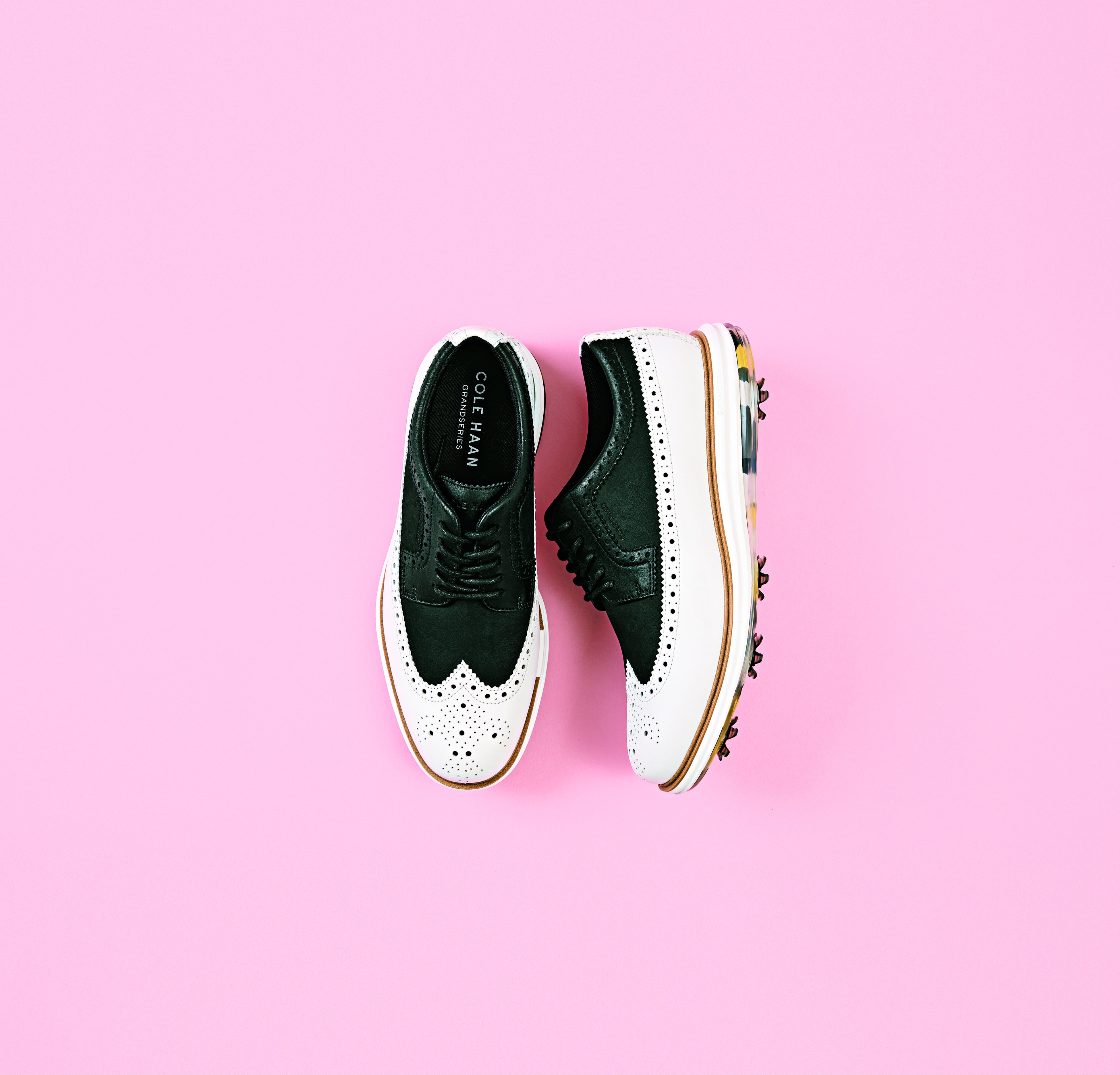 弾力のあるインソールが足裏にフィットし、1 ラウンド 18 ホールも軽やかに歩けます。バイカラーの足元が着こなしをスタイリッシュにシフト。