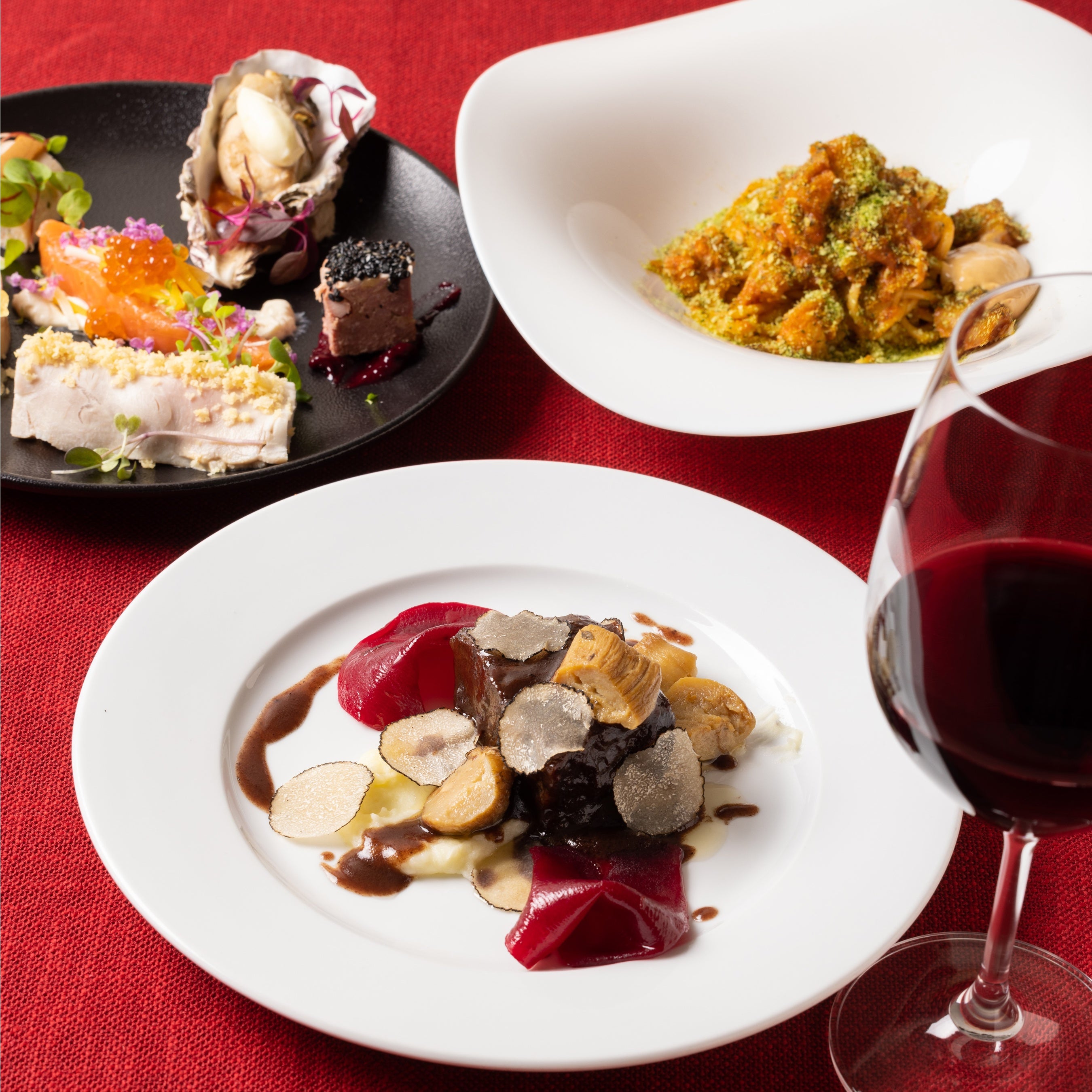 アミューズの「牡丹エビのコンフィキャビア添え」や一品料理の「クエのリゾットブイヤベース風」など、豪華食材を活かした料理が次々に登場するクリスマスコースは全6品。旬のアンコウなどを使ったパスタ「ボスカイオーラ」には濃厚なあん肝のムースを添え、「山形牛の頬肉赤ワイン煮込み」にトリュフを削りかけてご提供します。