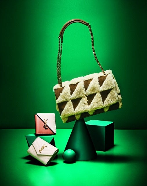 トライアングルのパッチワークがモダンなチェーンバッグは、YSLシグネチャーが引き立つウォレットをセットにしても。