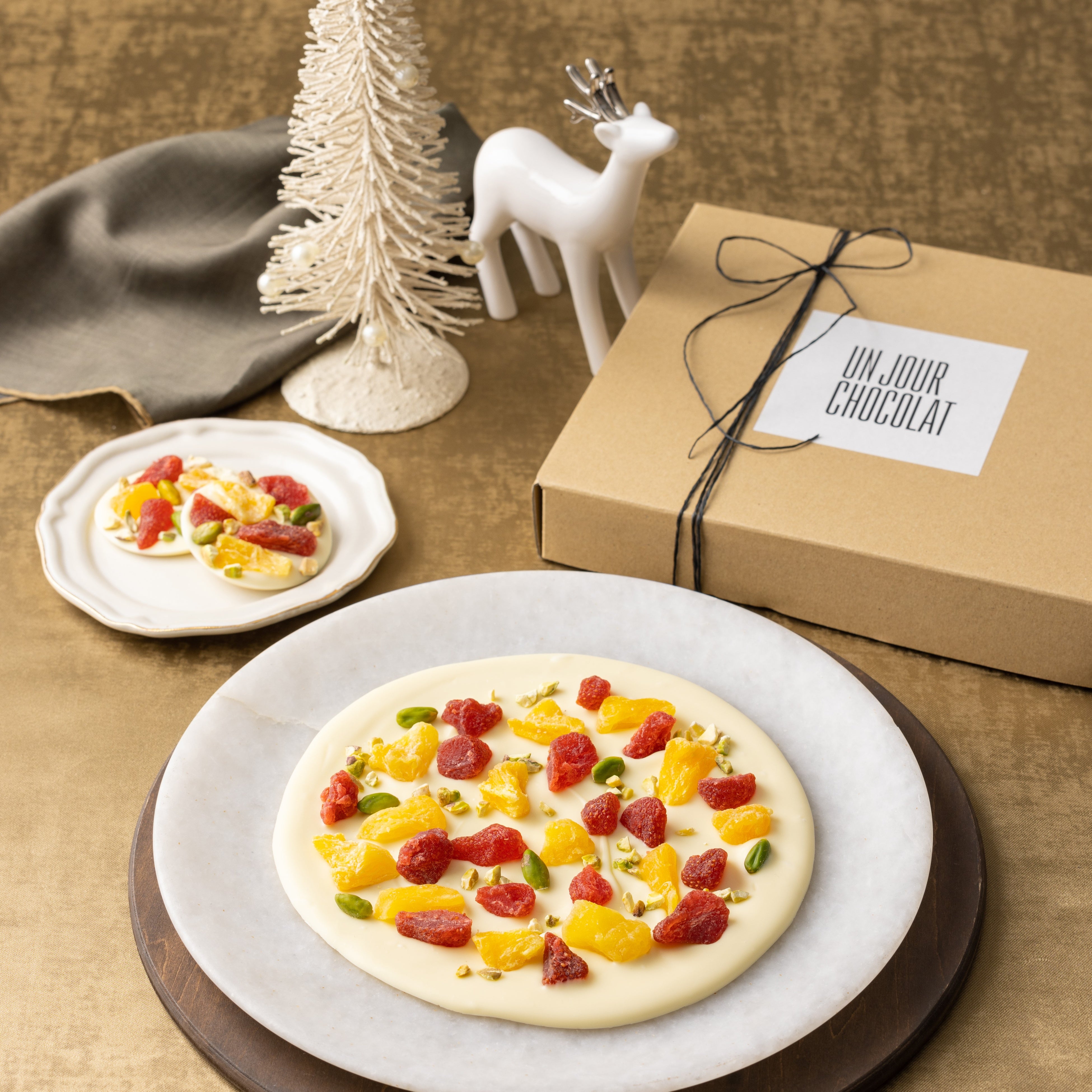 「アンジュールショコラ」の人気商品「ラウンドショコラ」は、直径約20cmのチョコレートにナッツなどの食材を混ぜ込んだもの。クリスマスにはホワイトチョコレートにドライマンゴーやドライストロベリー、ピスタチオをトッピングした、華やかな「ラウンドショコラ クリスマス」が登場します。「大」は箱入り、「小」は個包装。