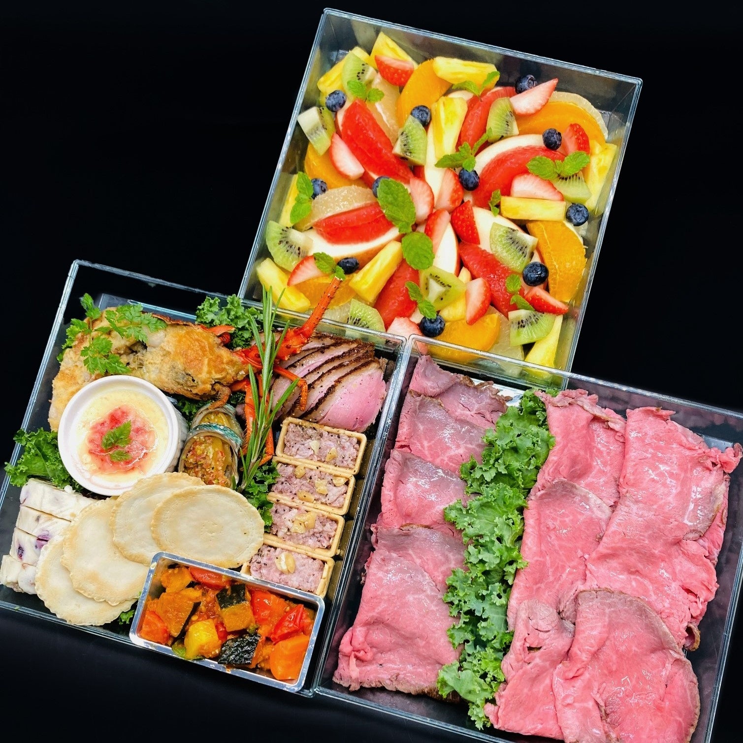 バラエティ豊かな前菜7種類が詰まったオードブル1段と、3種類の中からお好みの2種類を選べる3段BOX。「7種類のオードブル」以外の2段は、「熊本県産黒毛和牛ローストビーフの食べ比べ」「国産牛ほほ肉のブラッサート」「フルーツの盛り合わせ」の3種類の中から2種類をお選びいただけます。ご注文は1段から可能です。