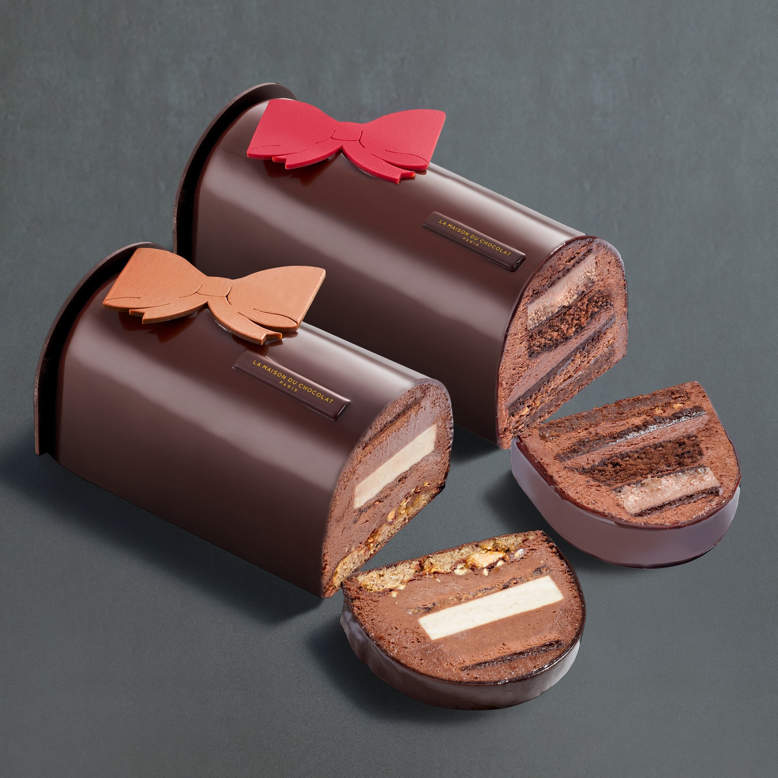 「ビュッシュ ドゥ ノエル カラカス」はアーモンドとチョコレートの生地に濃厚なチョコレートクリームやクッキー、ムースを重ねたクラシックなチョコレートケーキ。「ビュッシュ ドゥ ノエル プラリネ」はヘーゼルナッツの生地にジャンデュジャ、バニラクリーム、プラリネムースを重ねた、風味豊かなチョコレートケーキです。