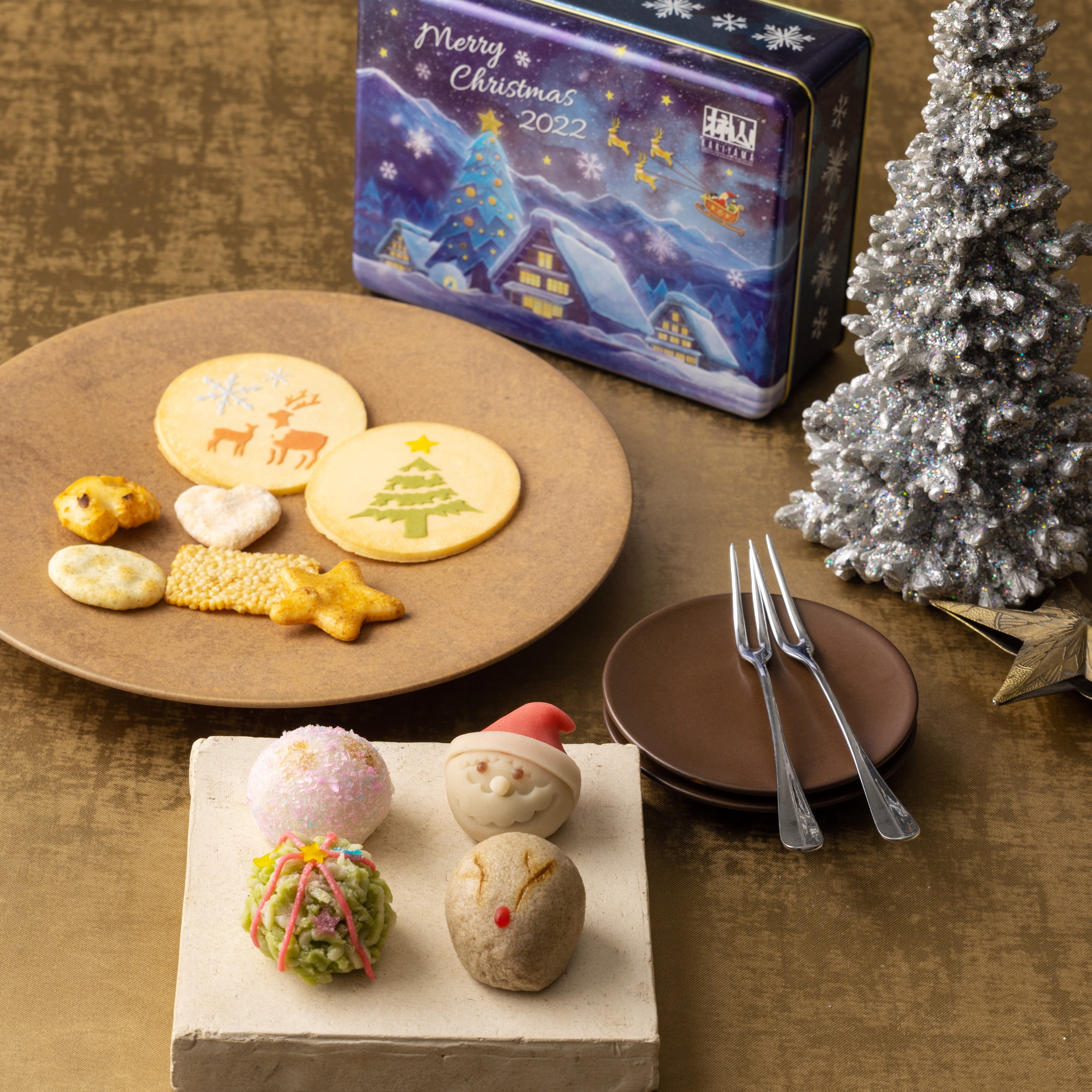 「赤坂柿山」の「メリークリスマス」は、クリスマス限定のおかきの詰め合わせ。「世界中を旅するサンタクロース」をテーマとした年号入りの缶はコレクターもいるほど人気です。浜松市の老舗「巖邑堂」の5代目当主による「クリスマス上生」は、ピスタチオなどの洋風素材を巧みに使いこなしたオリジナル上生菓子。贈り物にも最適です。