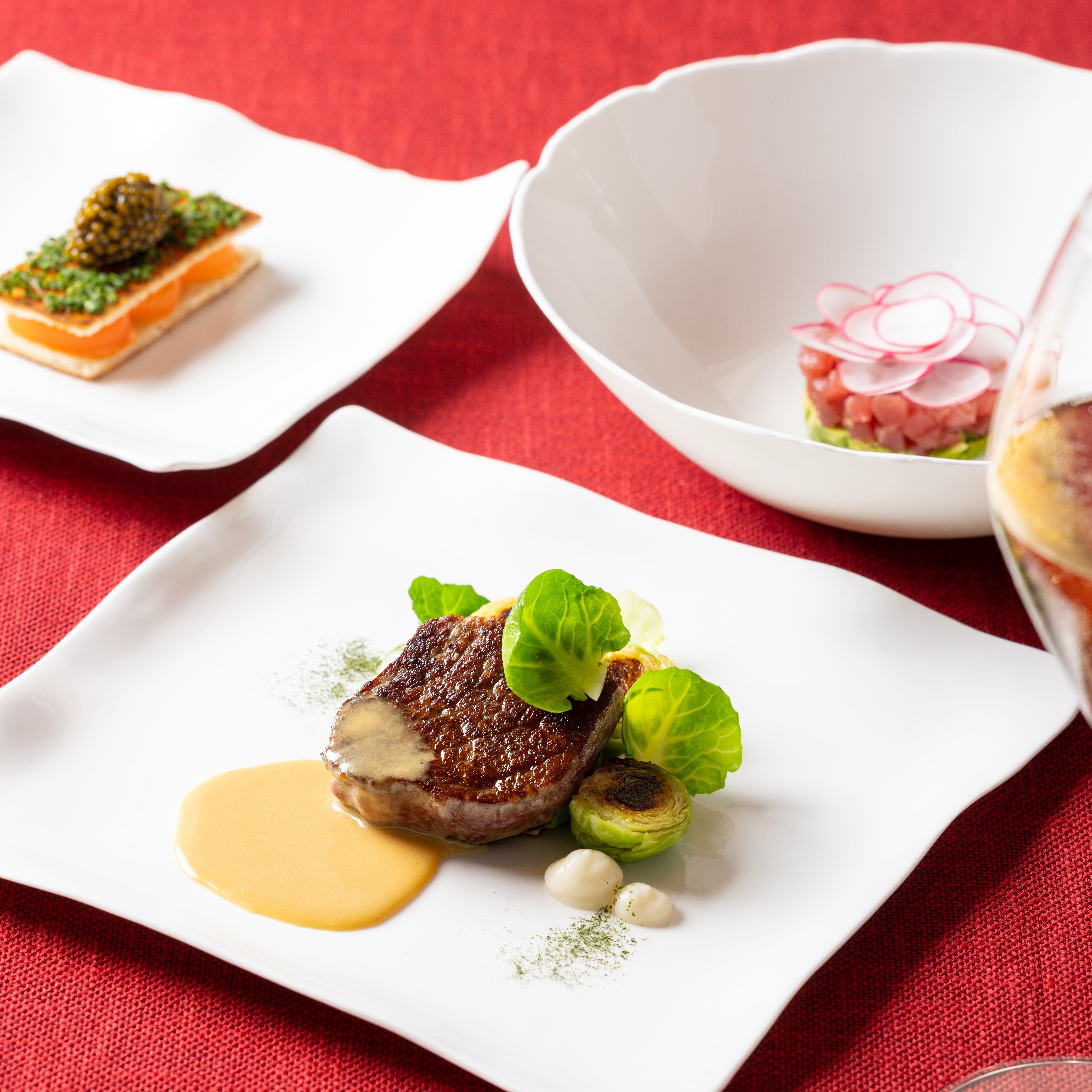 旬の食材を匠の技で仕立てた華やかなクリスマスコースはアミューズからデザート・小菓子まで全10品。フランスで熟成したキャビアと低温調理した卵黄のコクが調和した「トーステッド エッグキャビア」や、「本マグロ赤身のタルタル スパイシーラディッシュ ジンジャーマリナードソース」、黒毛和牛のローストなどが登場します。