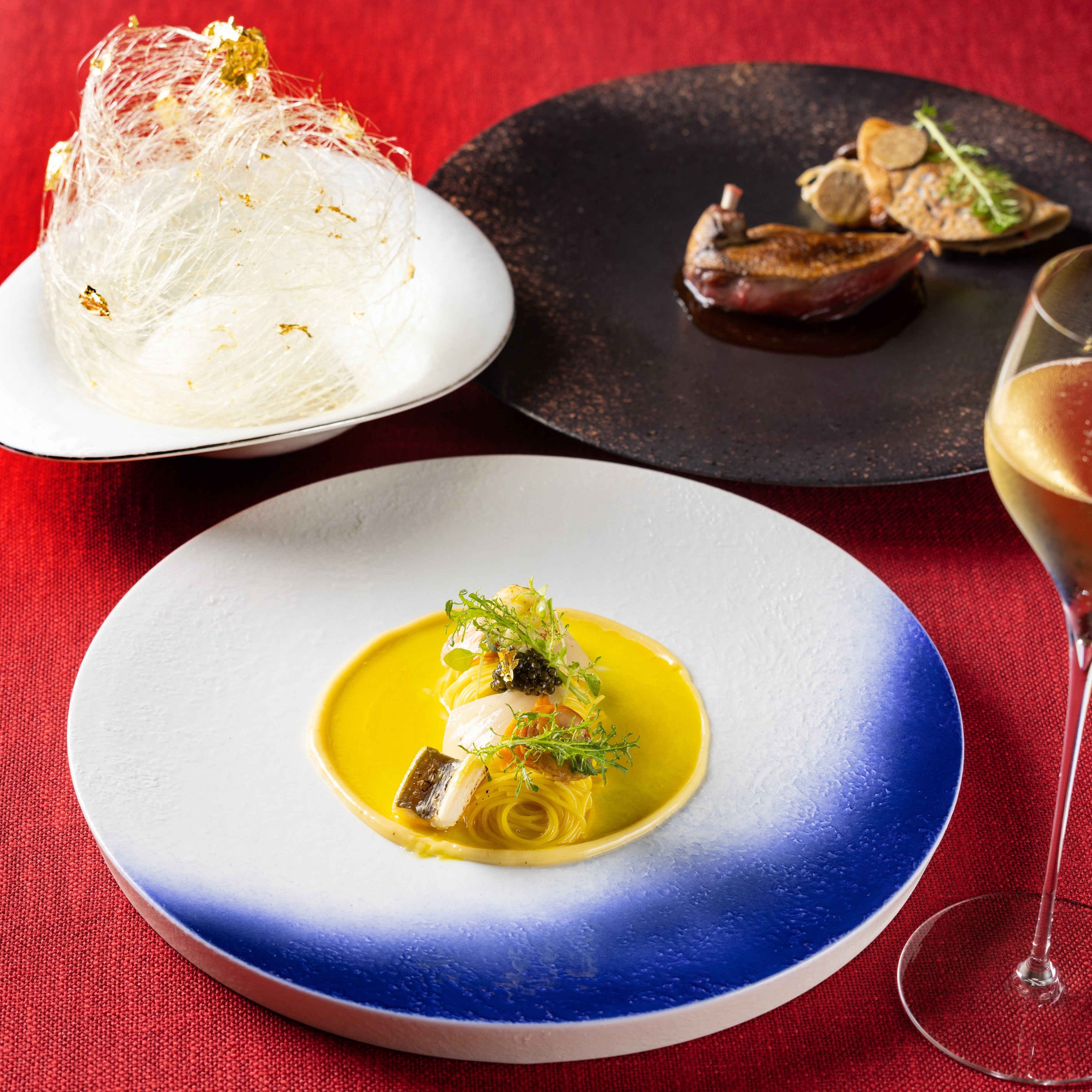 昼夜共に1日16食のスペシャルコースは3種類。ブイヤベースをイメージしたサフラン入りのソースが鮮やかな「オールスター 海幸“カッペリーニ”」と、ご予約の際にジビエ(野鳩)か和牛を選べる¥16,500 のコースです。シャンパーニュを含めたスぺシャルワインぺアリング(¥6,600または¥8,800)と共にどうぞ。