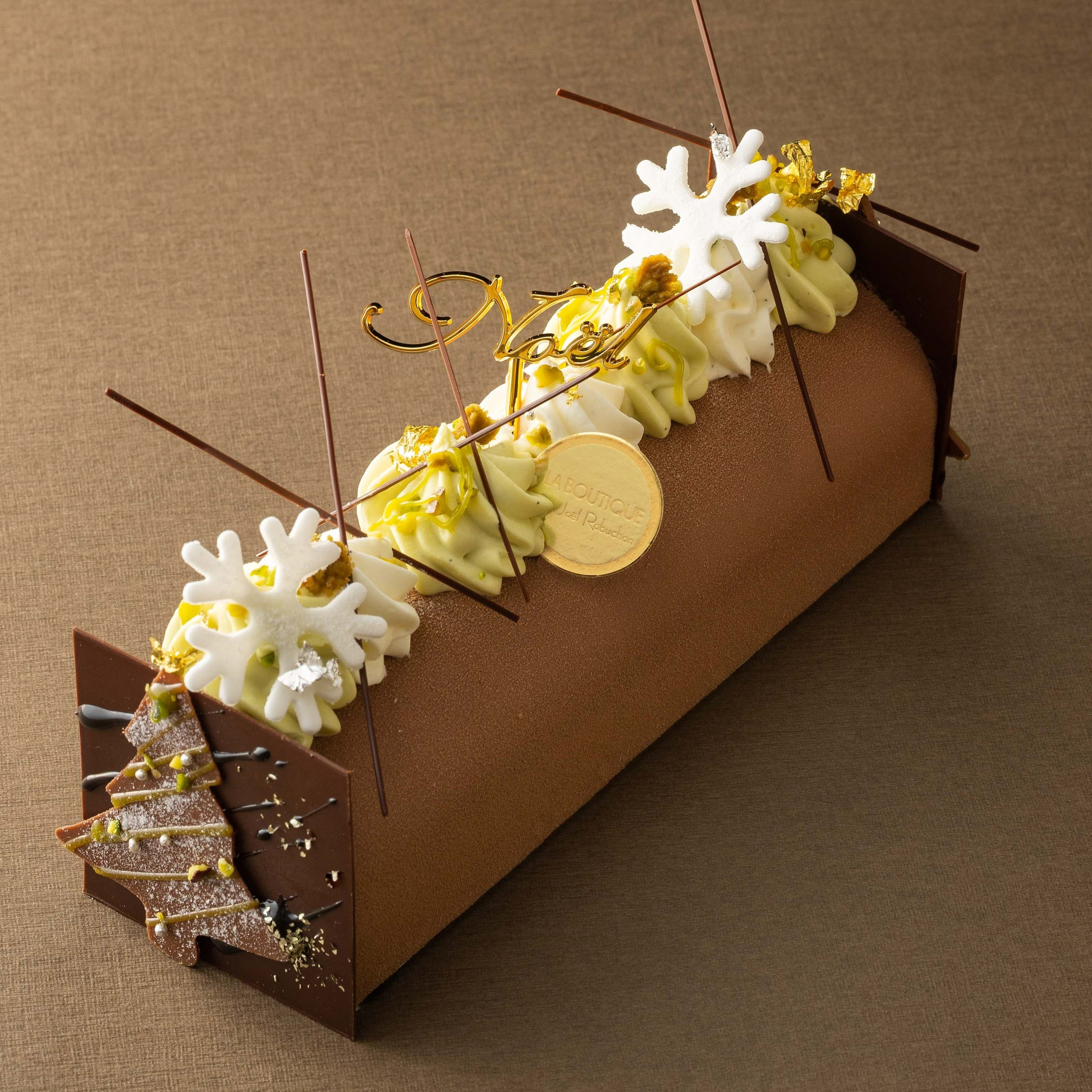 ロブションで毎年人気の「ブッシュドノエル」は、薪のような形をしたフランスの伝統的なクリスマスケーキ。今年はショコラとピスタチオの風味を活かした濃厚なムースに、いちごとフランボワーズのジュレを合わせた新作が登場します。香りのよいピスタチオはイタリア産の上質なもの。さまざまな食感と香りをお楽しみください。
