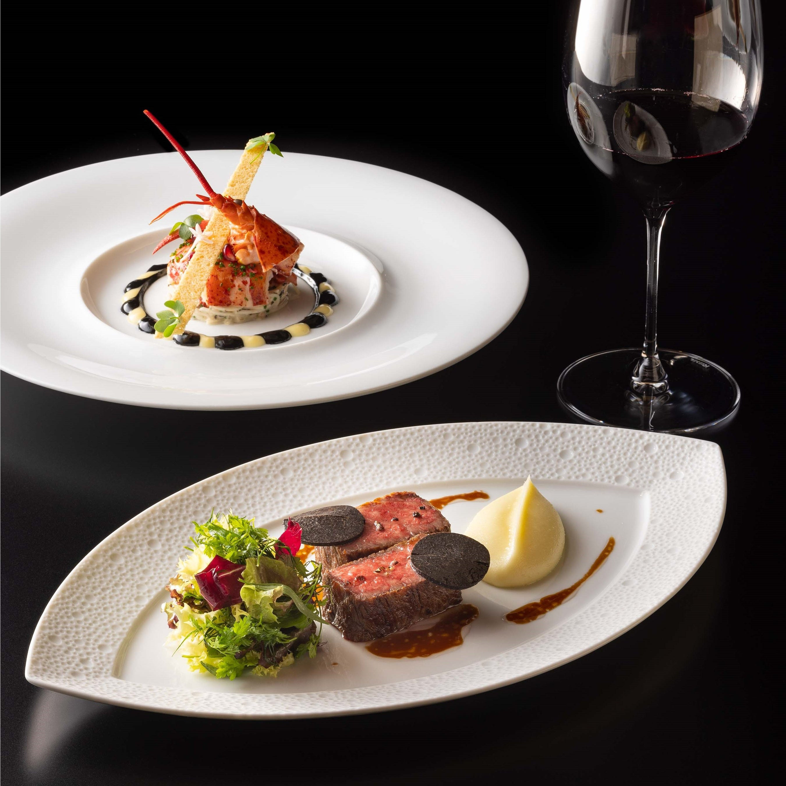 前菜・温前菜・メイン(魚・肉)・プレデセール・デザートの6品のコース。前菜のオマール海老は根セロリと黒トリュフを組み合わせたリッチな味わいです。シェフが厳選したメインの和牛ヒレ肉は、ロブションのスペシャリテであるポテトピューレとサラダパストラルと共にお楽しみください。デザートはクリスマスツリーに見立てた一品をご用意しております。