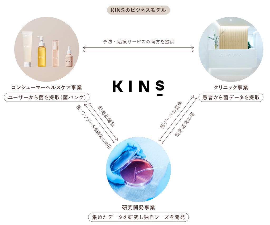 KINSは、1,000兆個と言われる全身の菌(常在菌)をケアすることを提案し、研究、開発、販売までを一気通貫して行う、マイクロバイオームに特化したヘルスケア企業です。累計10万人超のユーザーを抱え、皮膚・腸内・口腔内などマイクロバイオームがかかわる部位を対象としてプロダクトを展開するコンシューマープロダクト事業、日本にて2院の動物病院・シンガポールにて1院のヒト向けクリニックを展開するクリニック事業、約20,000検体を超えるヒト皮膚常在菌を郵送で回収し解析する独自の菌バンクプラットフォームを活用した自社ラボでの研究をかけ合わせる独自のビジネスモデルを通じて、疾患・症状への効果が期待される複数の独自菌獲得に成功しています。直近では、これらの独自菌を活用したプロダクトの開発や、菌自体の原料としての販売準備を進めています。KINSはこれからも、菌をケアすることが当たり前である世の中の実現を目指します。