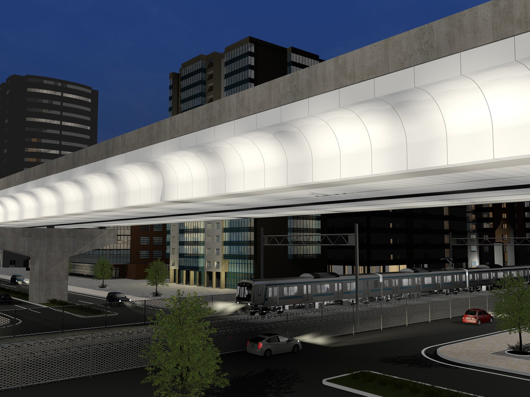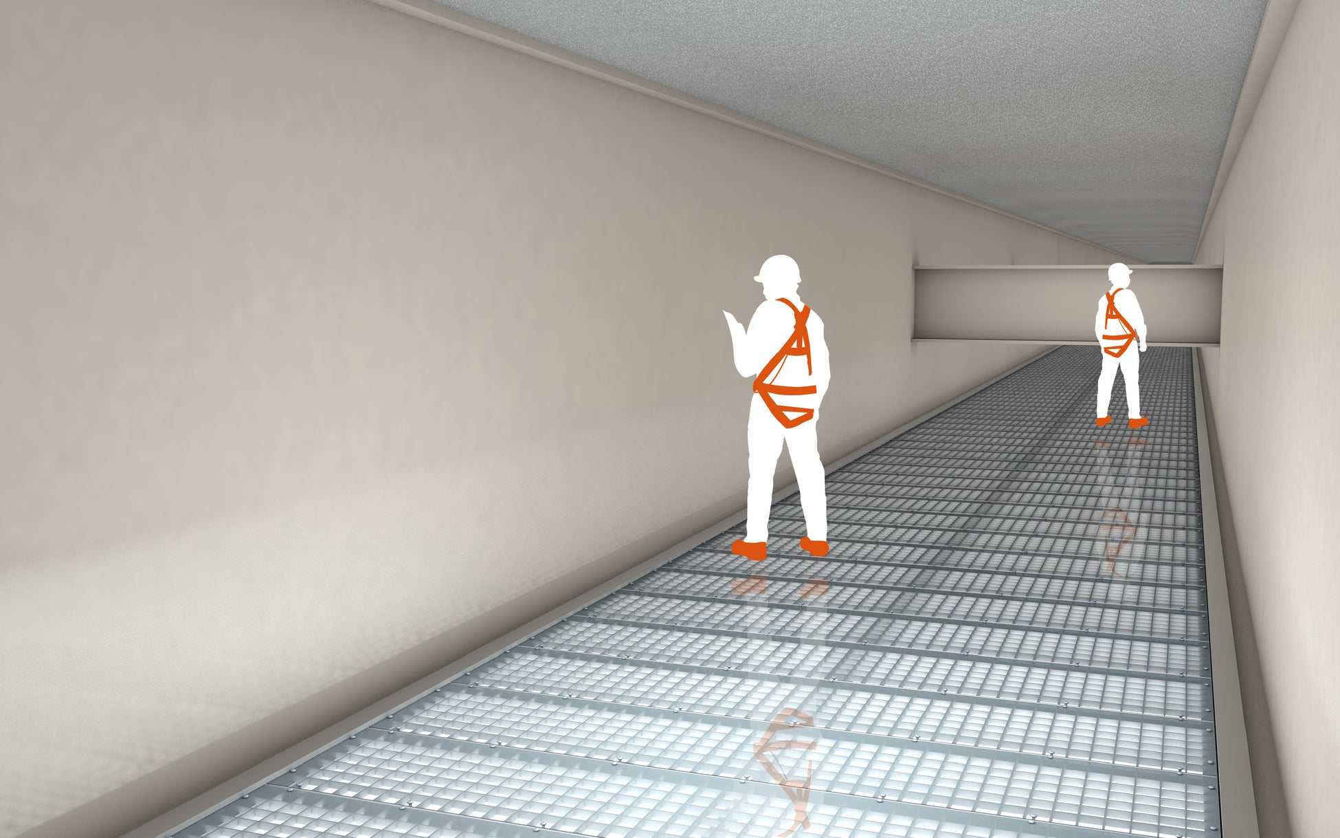 サン・ステラスは光を取り込み、紫外線をカットでき、耐燃焼性の高い膜材をはじめ、格子状のFRPやPVCプレートなどの複数部材で構成されたハイブリッドパネルです。安全性に配慮した全面フラットで明るい床面をもつ常設足場で、脚立や台車を使用した作業もでき継続的な点検・メンテナンスの作業効率が飛躍的に向上します。サン・ステラスで橋梁を覆うことで、紫外線や飛来塩分から守り、メンテナンス作業そのものを大幅に低減[福智3] [TK4] し,橋梁の長寿命化を可能にします。また、橋梁の側面は膜構造との組合せで、曲線形状を表現することも可能なため、夜間はライトアップにより、周辺環境に調和した美しい空間を演出できます。