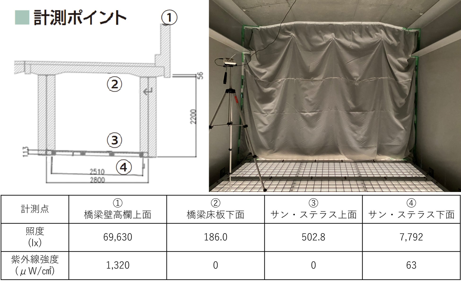 サン・ステラスを設置した橋梁内部の照度を計測すると、晴天時、点検空間は300lx、最大で500lx程度の照度が確保されました。これは厚生労働省が規定する「付随的な事務作業(文字を読み込む必要のない作業)」の作業照度に相当することから、晴天時にはライトで照らす必要はありません。