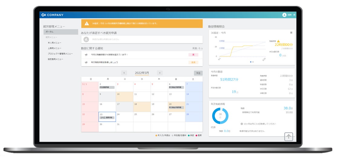 新機能である「勤怠ポータル」「勤怠ダッシュボード」の活用により、勤怠情報(残業時間、休暇日数等)が自動でグラフ化されます。従業員自身が自分の勤怠状況を把握したり、管理職が部下の勤怠状況をリアルタイムに把握したりすることが可能となり、より適切な勤怠管理が可能になります。