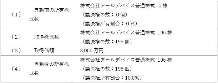 当社グループは、アールデバイスの既存株主から、以下のとおり同社株式を取得する予定です。また、アールデバイスと当社は、本株式取得を前提として、本資本業務提携に係る契約を締結いたします。