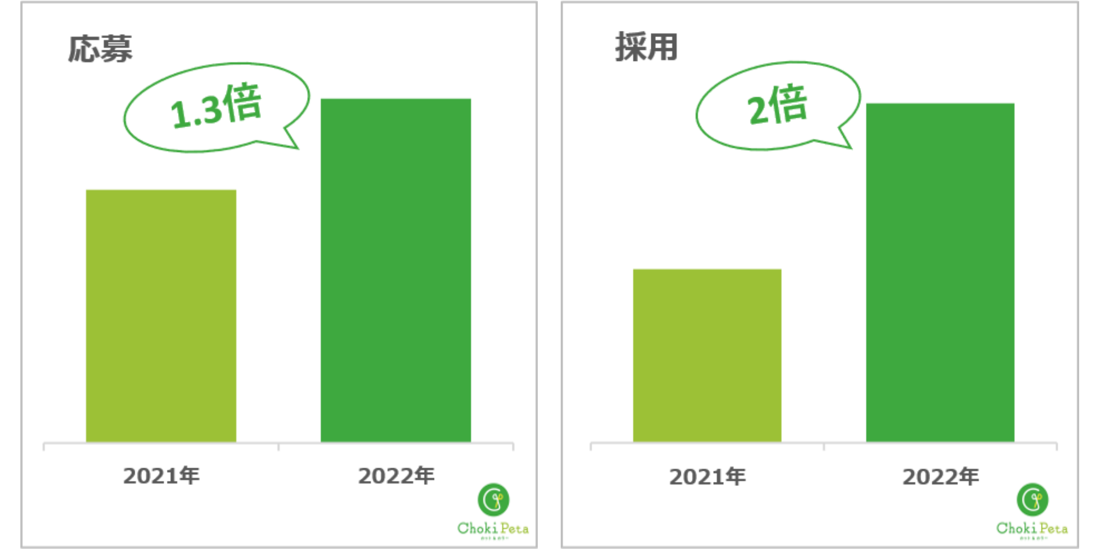チョキペタで働きたいと考える美容師が増加している理由は、美容師の働きやすさを考えた環境が整備されているからであると考えられます。チョキペタで働く美容師の約半数は元・休眠美容師です。オープン当初から休眠美容師の復帰支援に積極的に取り組み、これまで300人以上の休眠美容師を採用してきた実績があります。ブランクがあっても働きやすい環境が整っていることが復職の安心感となり、応募に繋がっていると考えられます。また、休眠美容師だけでなく、働きやすさや会社の将来性などを理由にマネージャーや店長クラスなど幹部候補の応募も好調に推移しています。